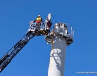 Seit Sonntag wurde durch die Stadtwerke Meiningen ein besonderes Anliegen an die Feuerwehr Meiningen herangetragen: Auf dem Schornstein des Heizkraftwerkes Ost in der Goethestraße begann ein Storch mit dem Bau eines Nestes.