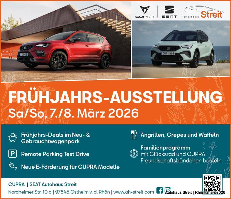 Im Mittelpunkt steht die Modellvielfalt rund um die Trendmarken CUPRA und SEAT mit starken Frühjahrsangeboten für Neu- und Gebrauchtwägen und umfangreichen Probefahrtmöglichkeiten. Umrahmt wird das Fest von einem abwechslungsreichen Programm für die ganze Familie und leckerer Verpflegung. Gleichzeitig findet in Ostheim das beliebte Frühlingsfest statt.