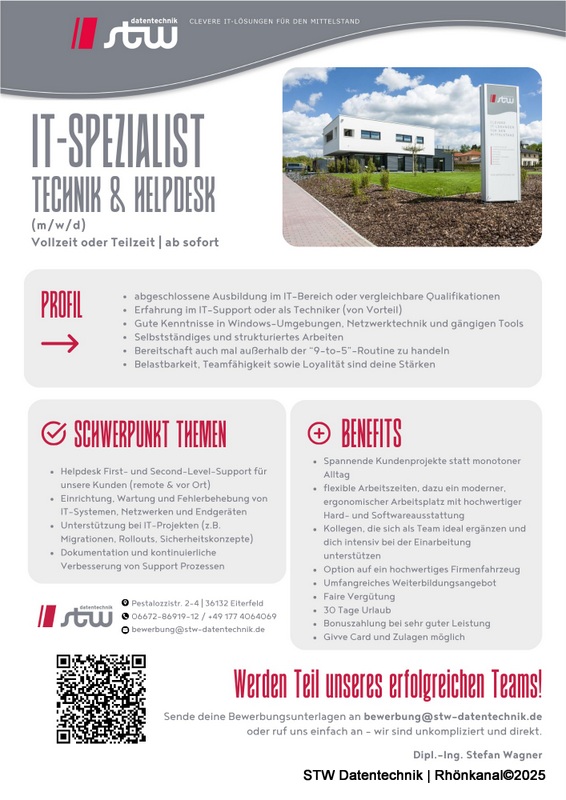 Sende deine Bewerbungsunterlagen an bewerbung@stw-datentechnik.de oder ruf uns einfach an - wir sind unkompliziert und direkt.