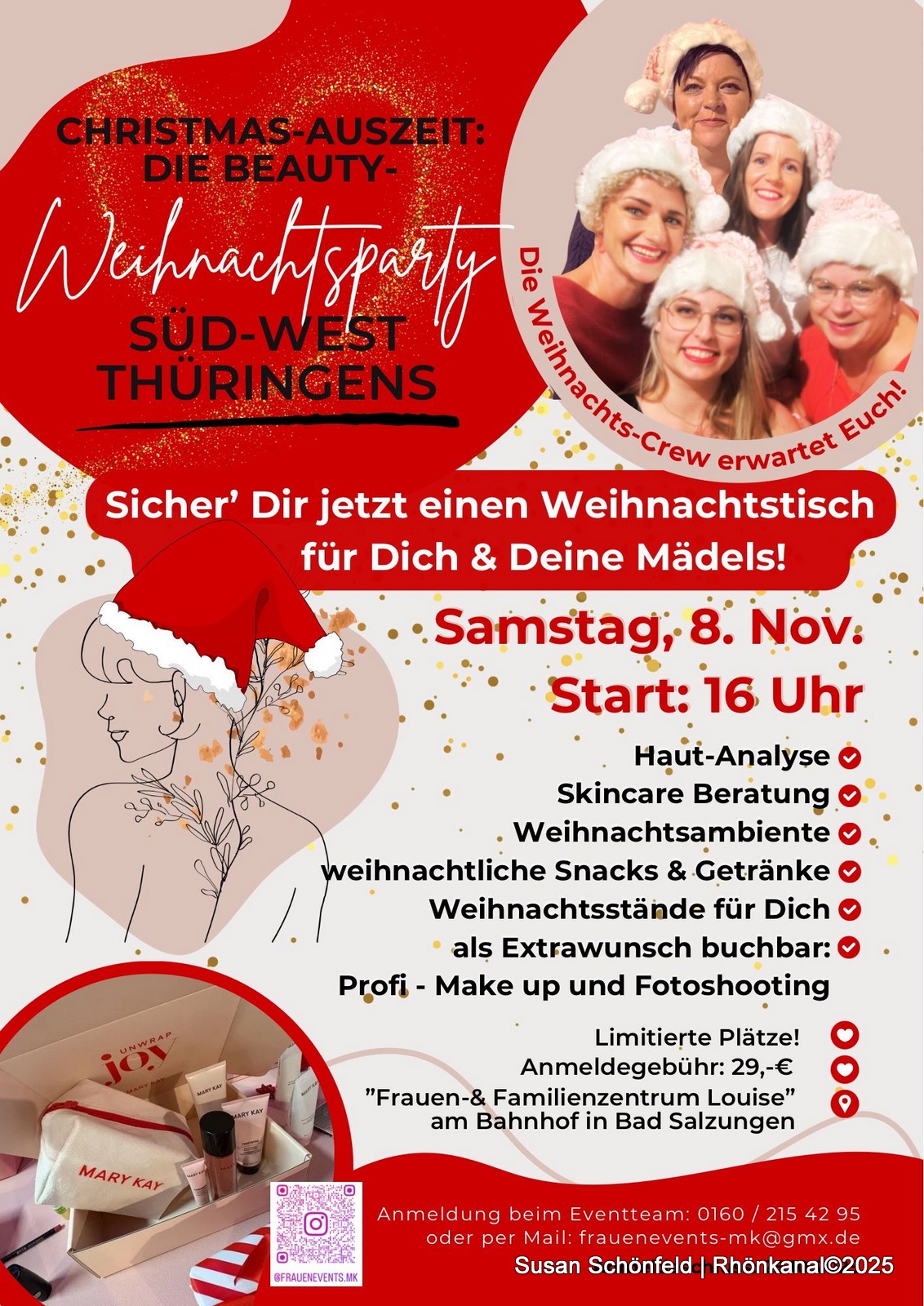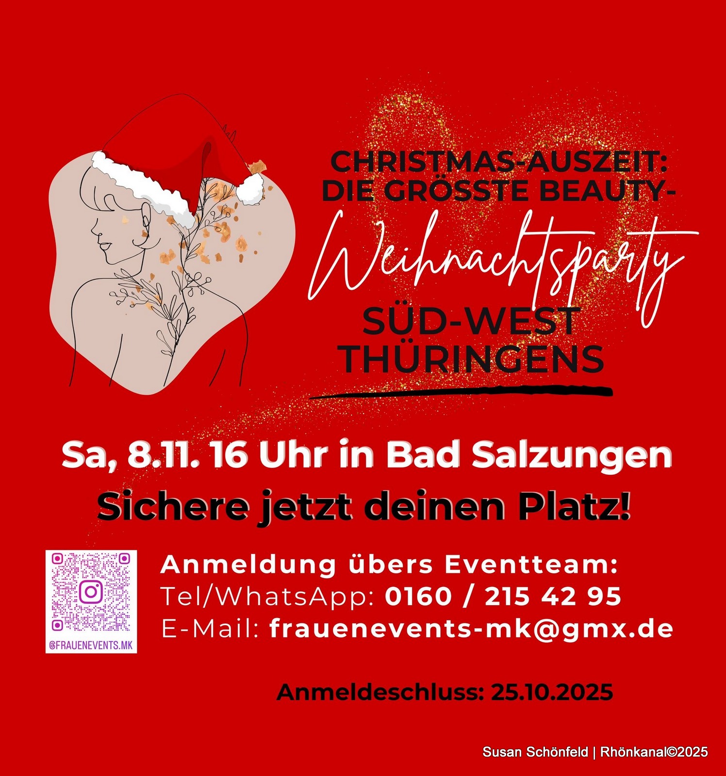 Am Samstag, den 8. November 2025, heißt es wieder: Beauty-Auszeit in Bad Salzungen. Nach dem vollen Erfolg im März starten Susan Schönfeld und ihr Team in die zweite Runde. Ganz nach dem Motto „Christmas-Auszeit - Die Beautyweihnachtsparty“!