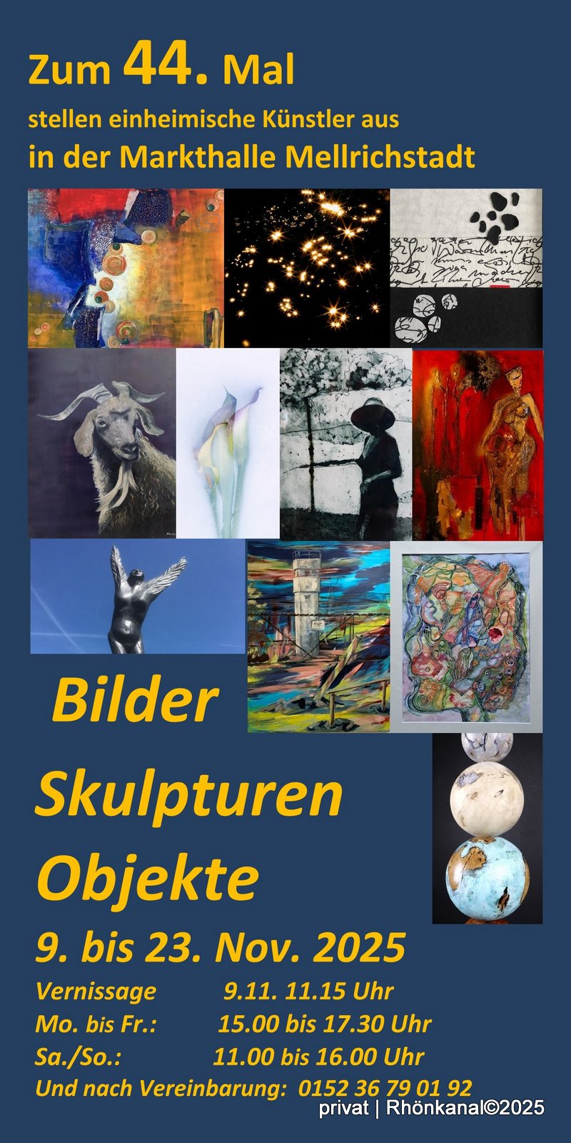 Vom 9. bis 23. November 2025 stellen einheimische Künstler in der Markthalle Mellrichstadt aus. Bereits zum 44. Mal gibt es Bilder, Skulpturen und Objekte zu sehen.