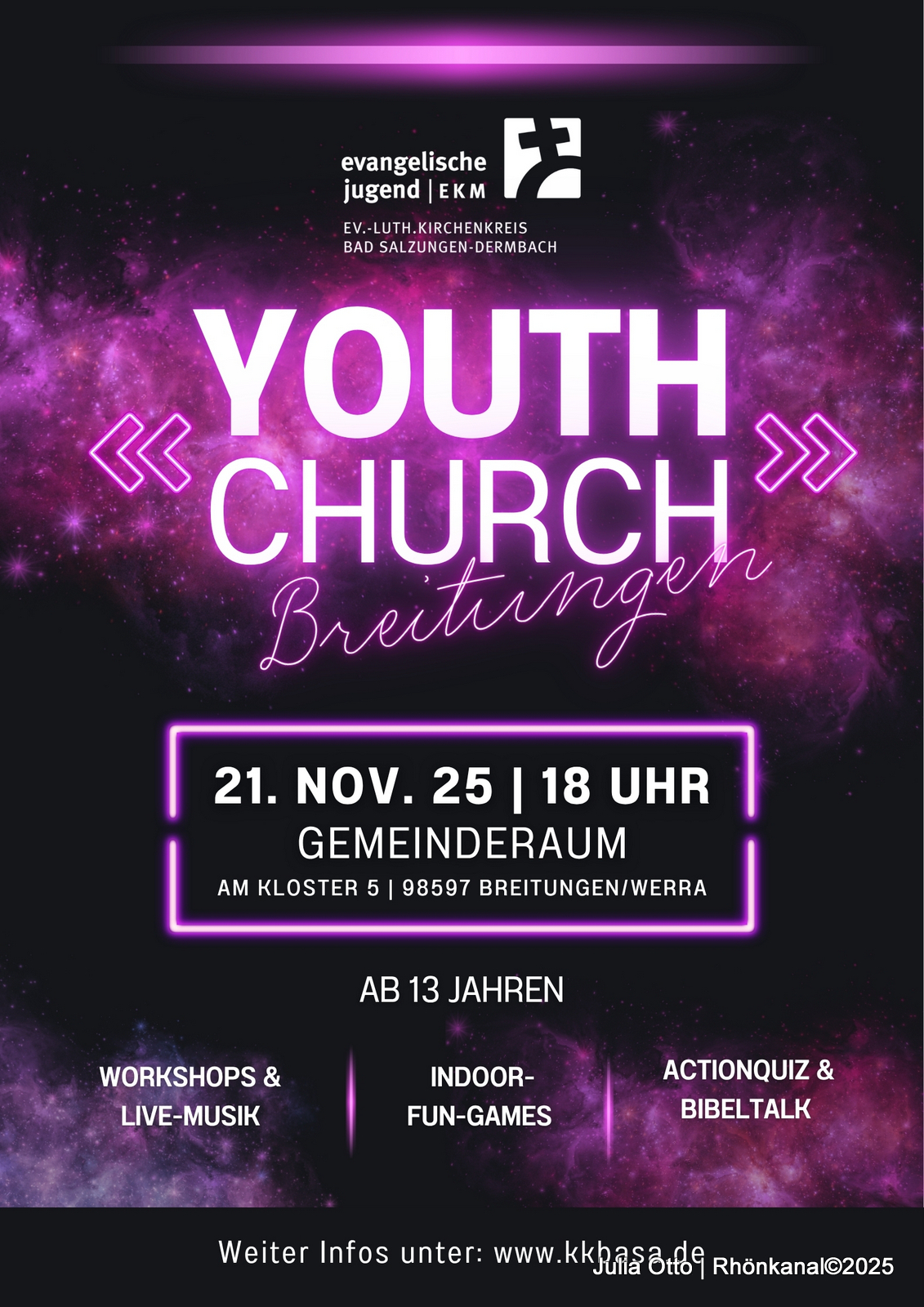Du hast Lust auf Live-Musik, Gemeinschaft und Fun-Games? Dann sei dabei bei der Youth Church in Breitungen am 21. November 2025!