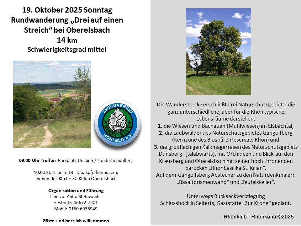 Am Sonntag, den 19. Oktober 2025, lädt der Rhönklub Zweigverein Hünfeld zur Rundwanderung „Drei auf einen Streich“ bei Oberelsbach ein. Die 14 Kilometer lange Strecke hat einen mittleren Schwierigkeitsgrad.