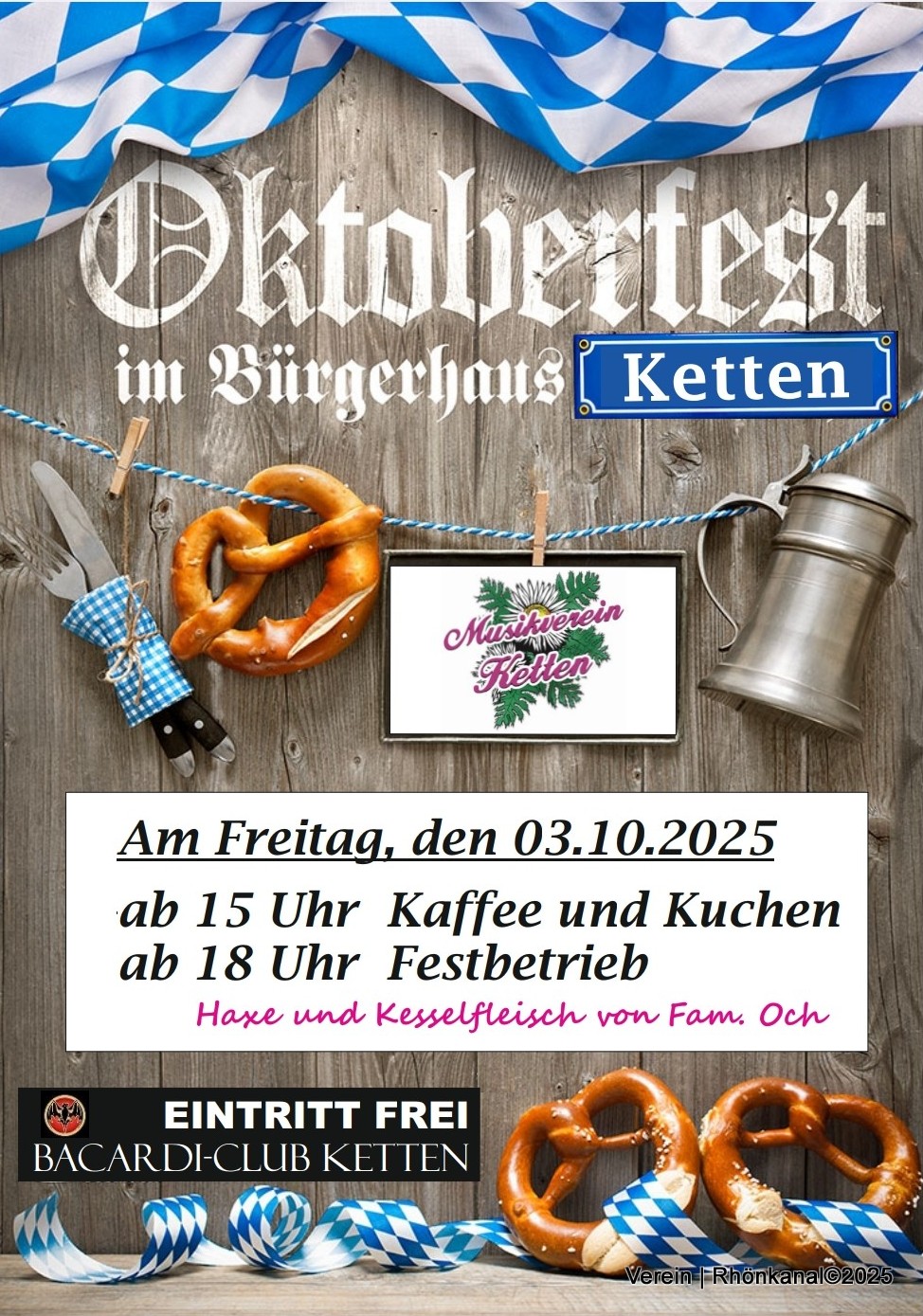 Am Freitag, den 3. Oktober 2025, wird herzlich zum Oktoberfest ins Bürgerhaus in Ketten eingeladen. Der „Bacardi-Club“ freut sich auf zahlreiche Gäste.