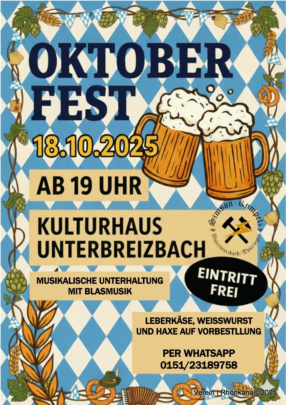 Am Samstag, den 18. Oktober 2025, wird in Unterbreizbach Oktoberfest gefeiert. Ab 19 Uhr laden die Simsonkumpelz herzlich ins Kulturhaus ein.