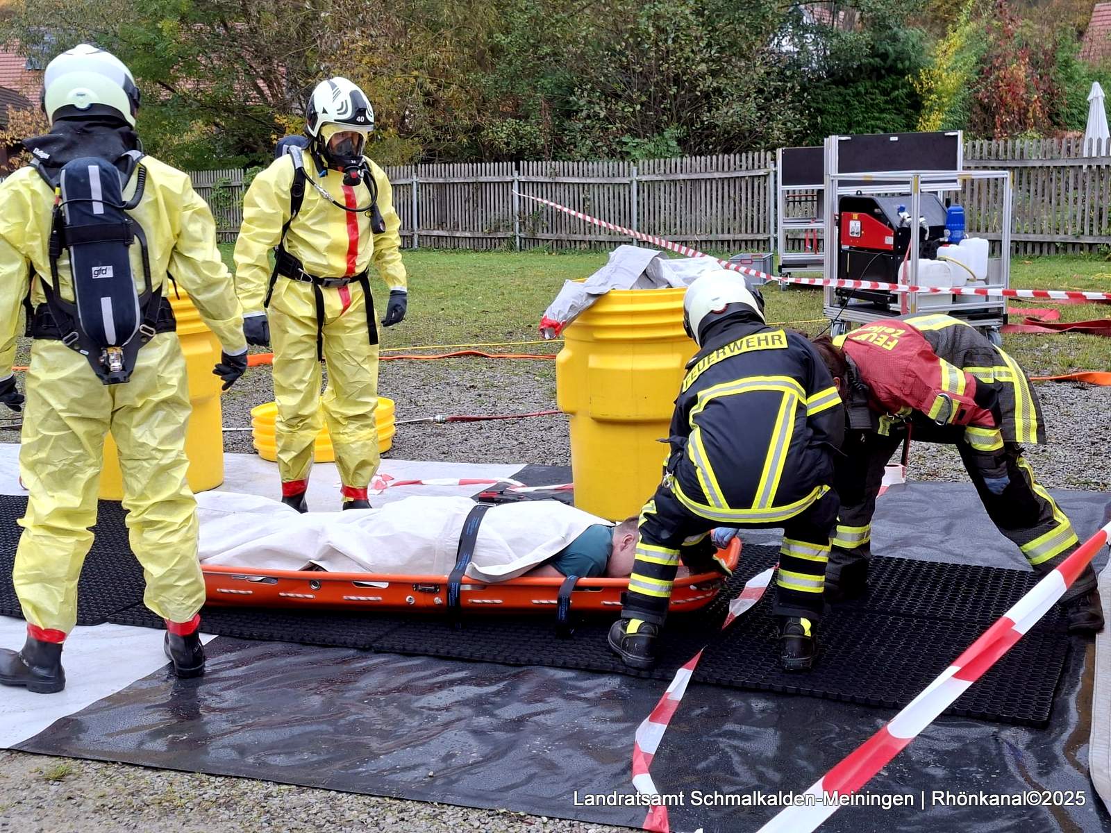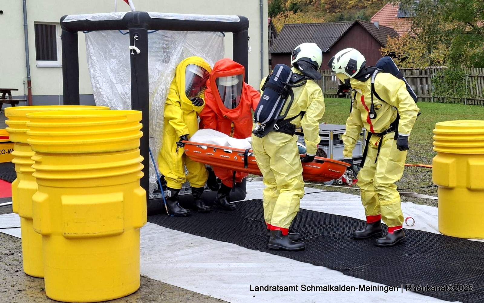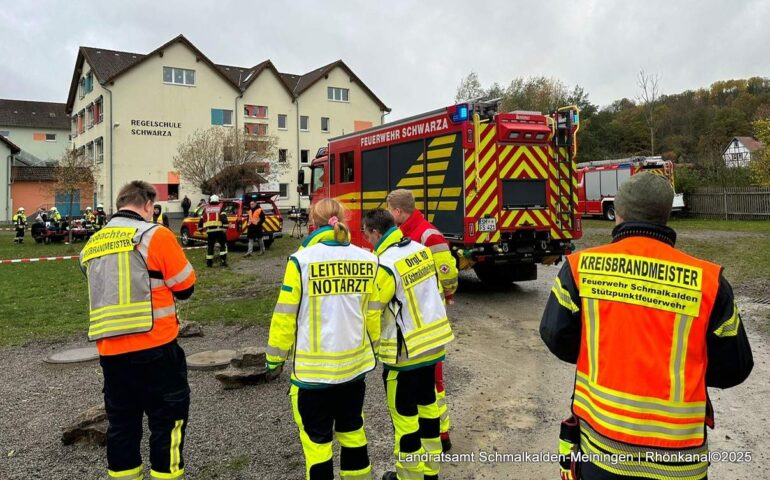 Bei der diesjährigen Gefahrgutübung des Landkreises Schmalkalden-Meiningen wurde ein realitätsnahes, fiktives Szenario geprobt, bei dem ein unbekannter gefährlicher Stoff bei einem Wochenend-Flohmarkt an der Regelschule Schwarza freigesetzt und mehrere Personen verletzt wurden.