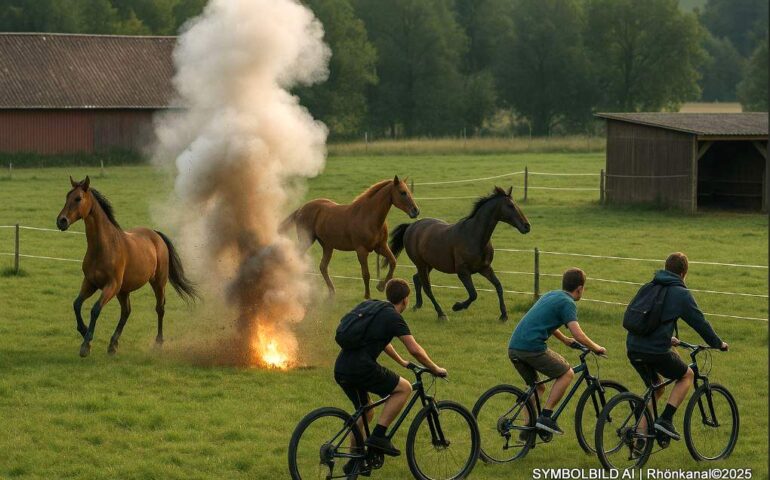 Am Dienstagabend, dem 07.10.2025, kam es gegen 18:40 Uhr in Kaltennordheim zu einem gefährlichen Zwischenfall. Eine Zeugin beobachtete eine Gruppe Jugendlicher auf einer Wiese nahe eines Stalls in der Mühlgasse. Kurz darauf entstand bei ihnen eine Rauchwolke, die wenig später brannte und explodierte.