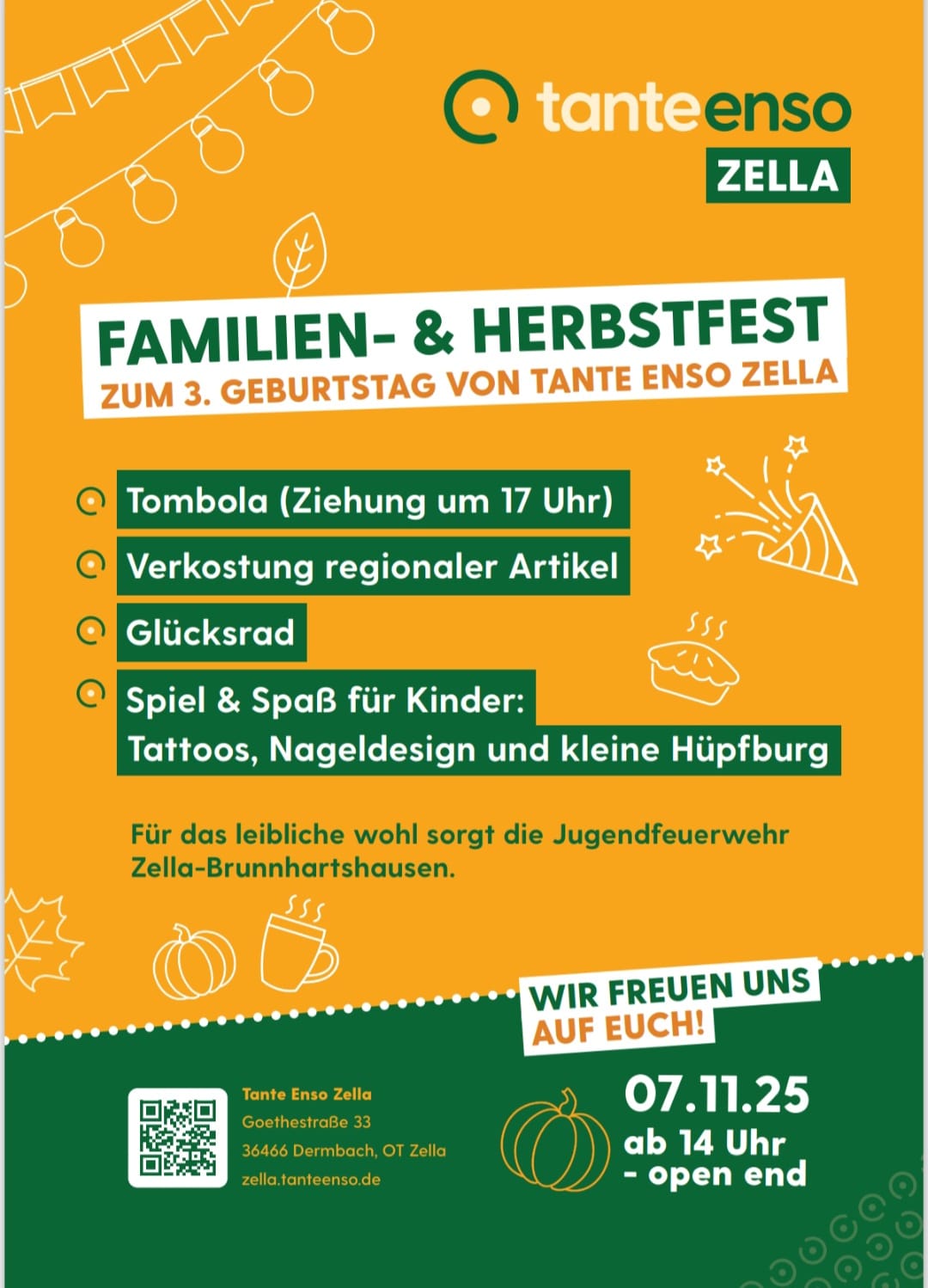 Seit der Eröffnung ist der Markt zu einer festen Größe in der Region geworden und bietet für Zella/Rhön und die umliegenden Orte eine unverzichtbare regionale Einkaufsmöglichkeit. Dieses Jubiläum soll gebührend gefeiert werden, mit einem bunten Familien- & Herbstfest für Groß und Klein!