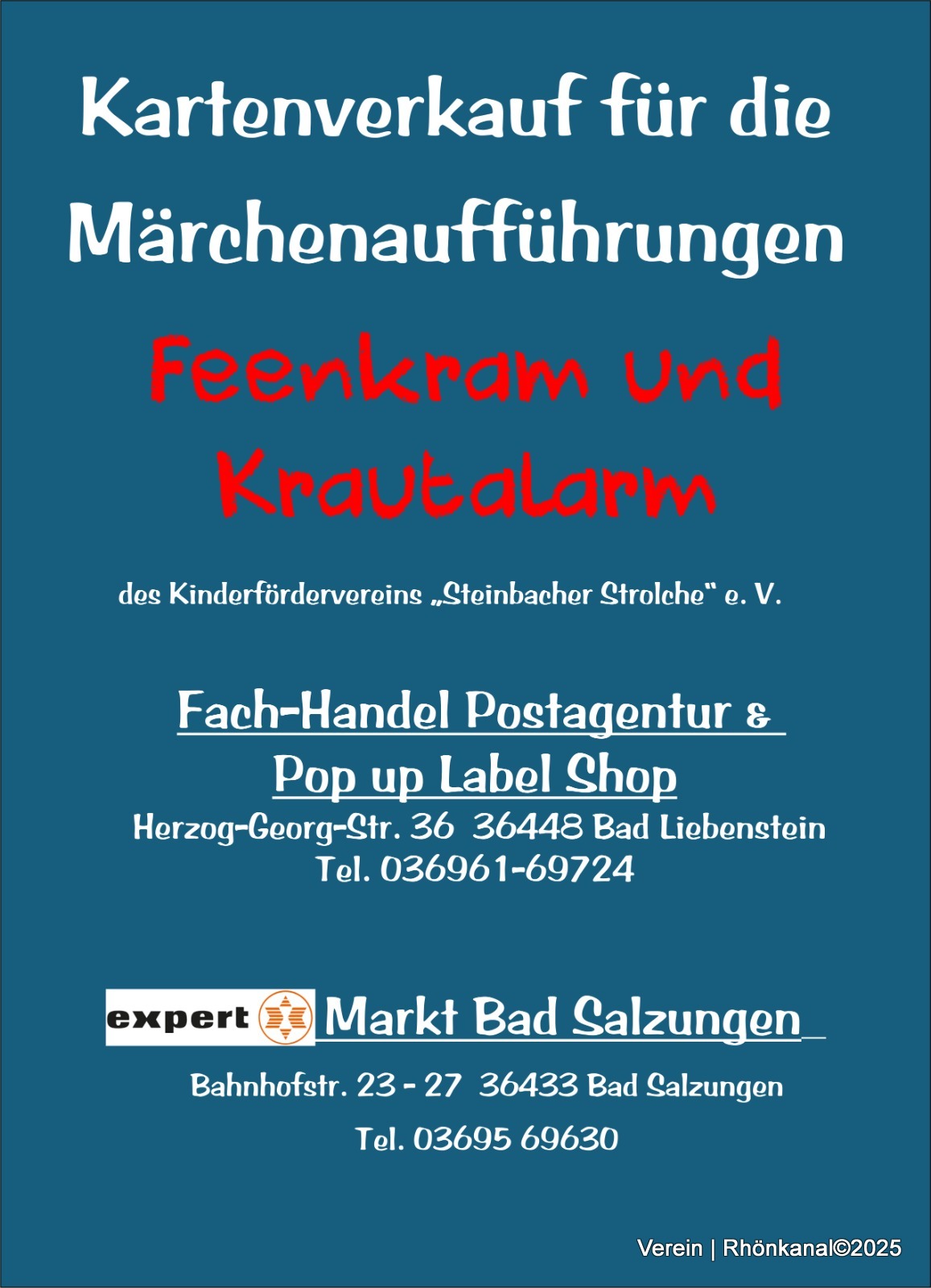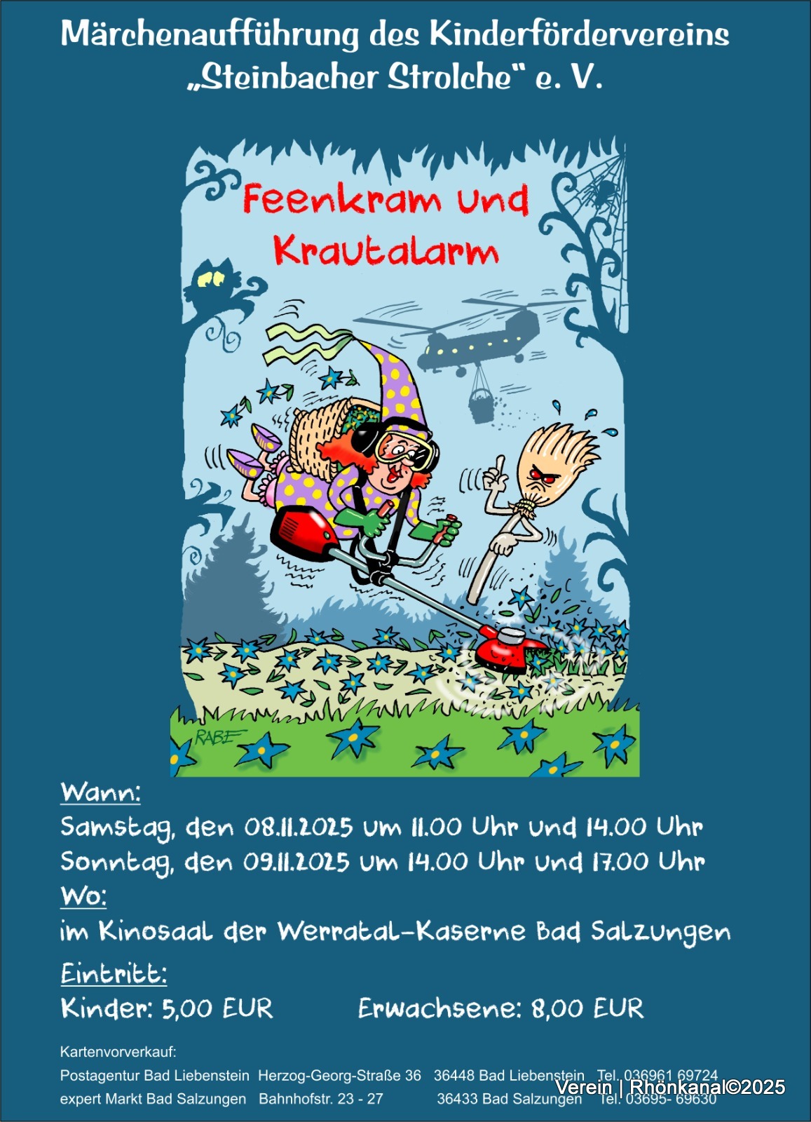 Der Kinderförderverein "Steinbacher Strolche e.V " führt in diesem Jahr das 19. selbstgeschriebene Märchen auf. „Feenkram und Krautalarm“ wird am 8. und 9. November 2025 in Bad Salzungen aufgeführt.
