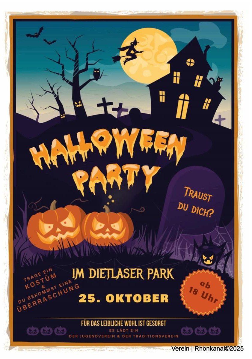 Am Samstag, den 25. Oktober 2025, wird herzlich zur Halloween-Party in Dietlas eingeladen. Die Party startet um 18 Uhr im Park. Für das leibliche Wohl ist gesorgt.