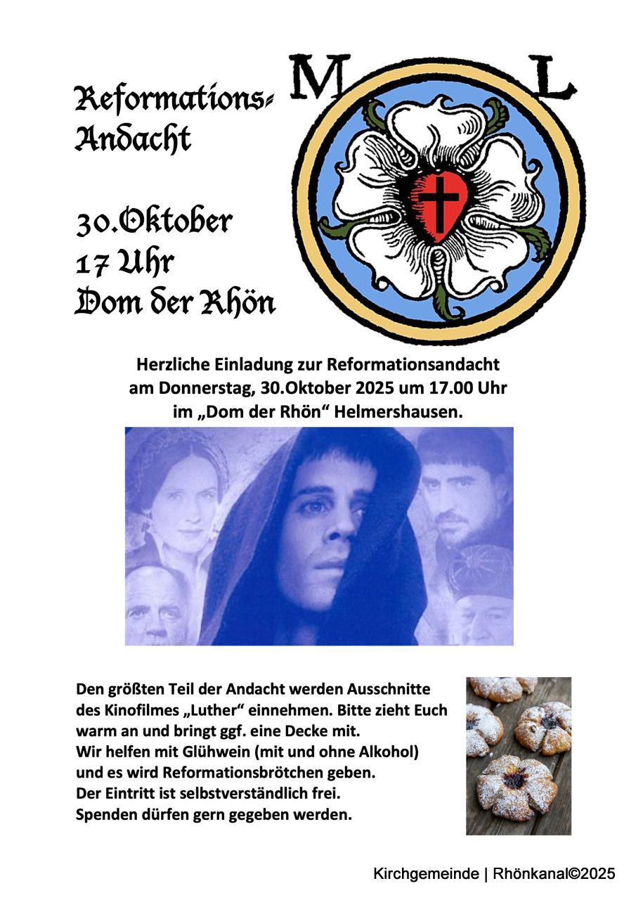 Am Donnerstag, den 30. Oktober 2025, wird herzlich zur Reformationsandacht in den Dom der Rhön eingeladen. Die Kirchgemeinde Helmershausen zeigt ab 17 Uhr verschiedene Ausschnitte des Kinofilms „Luther“.