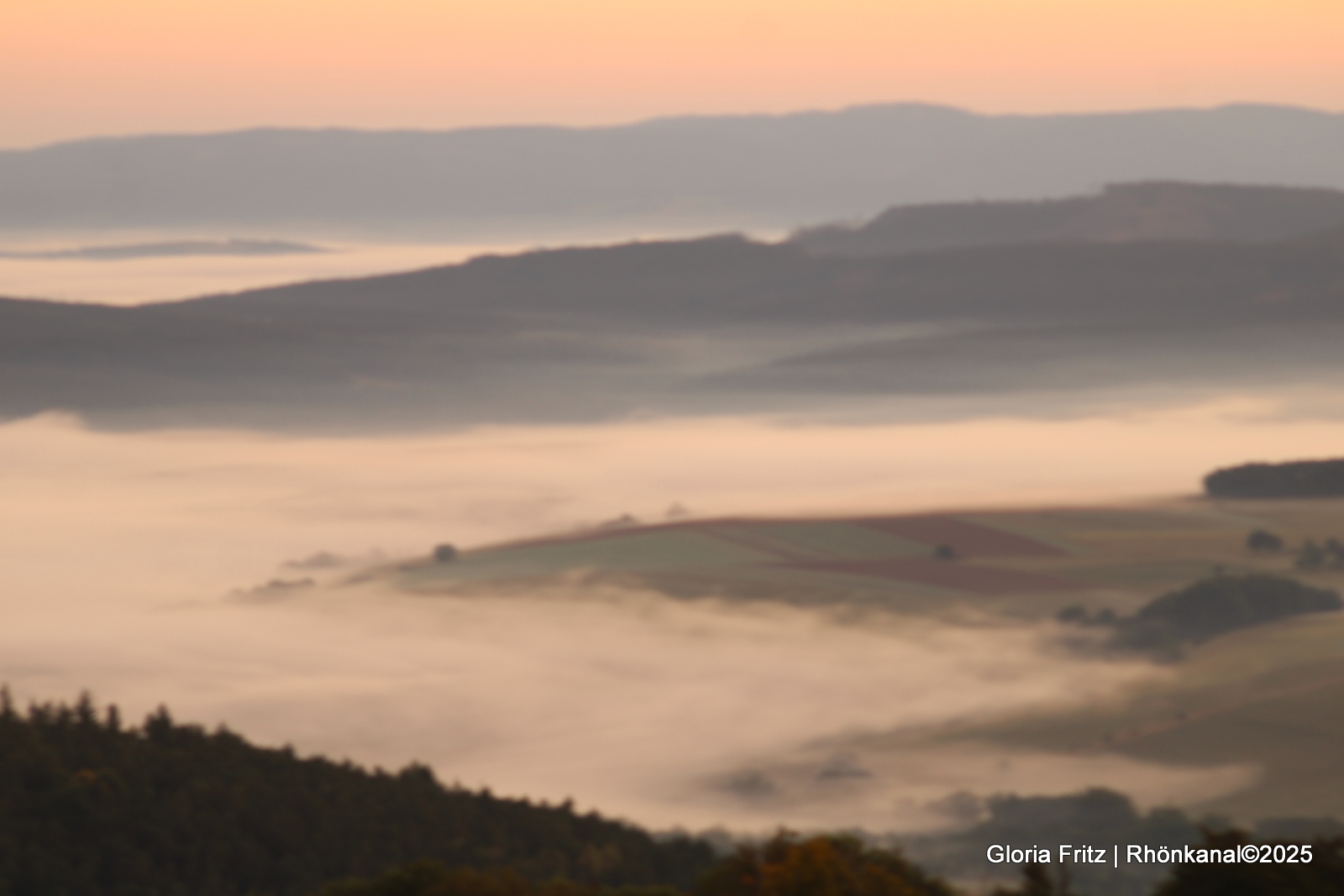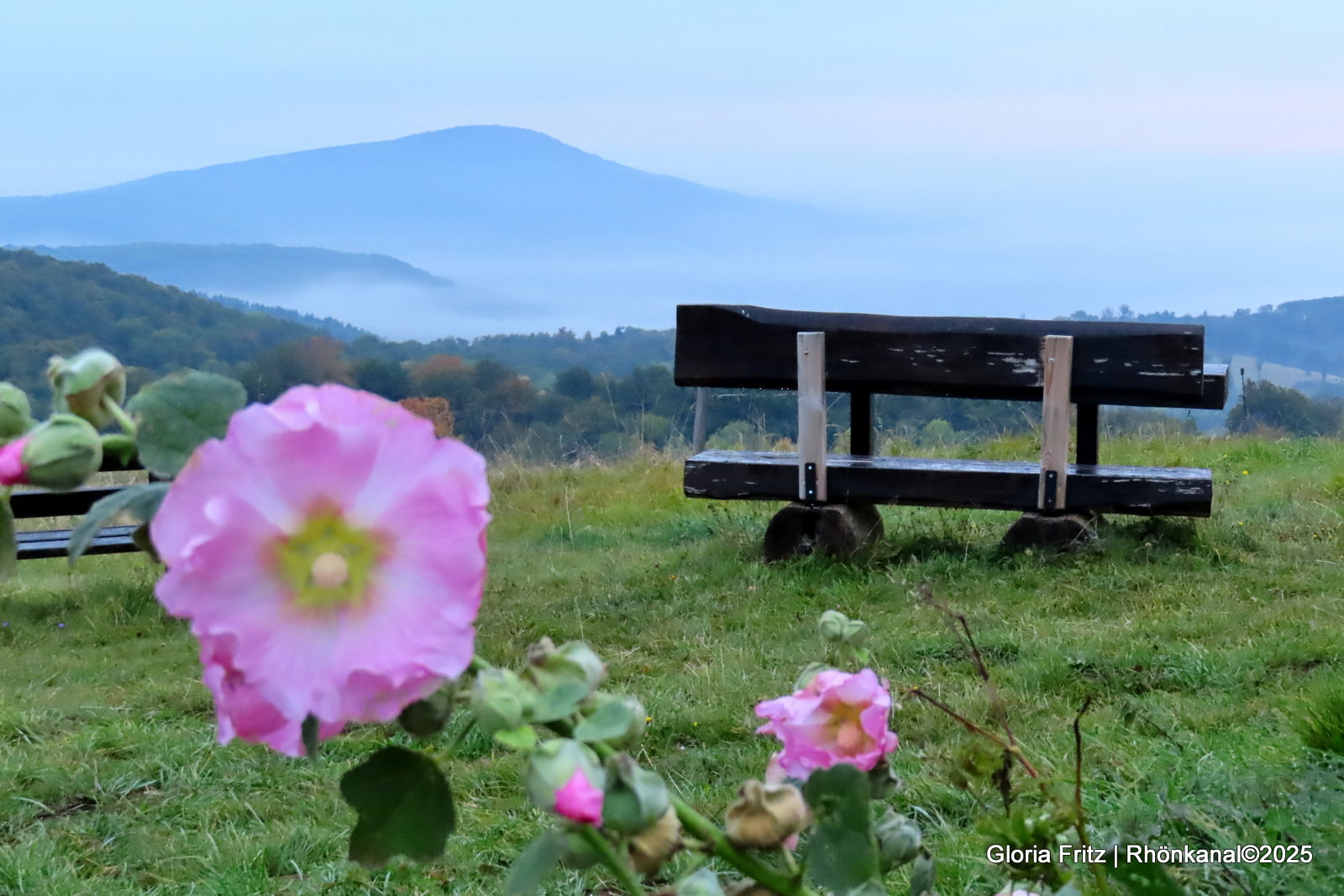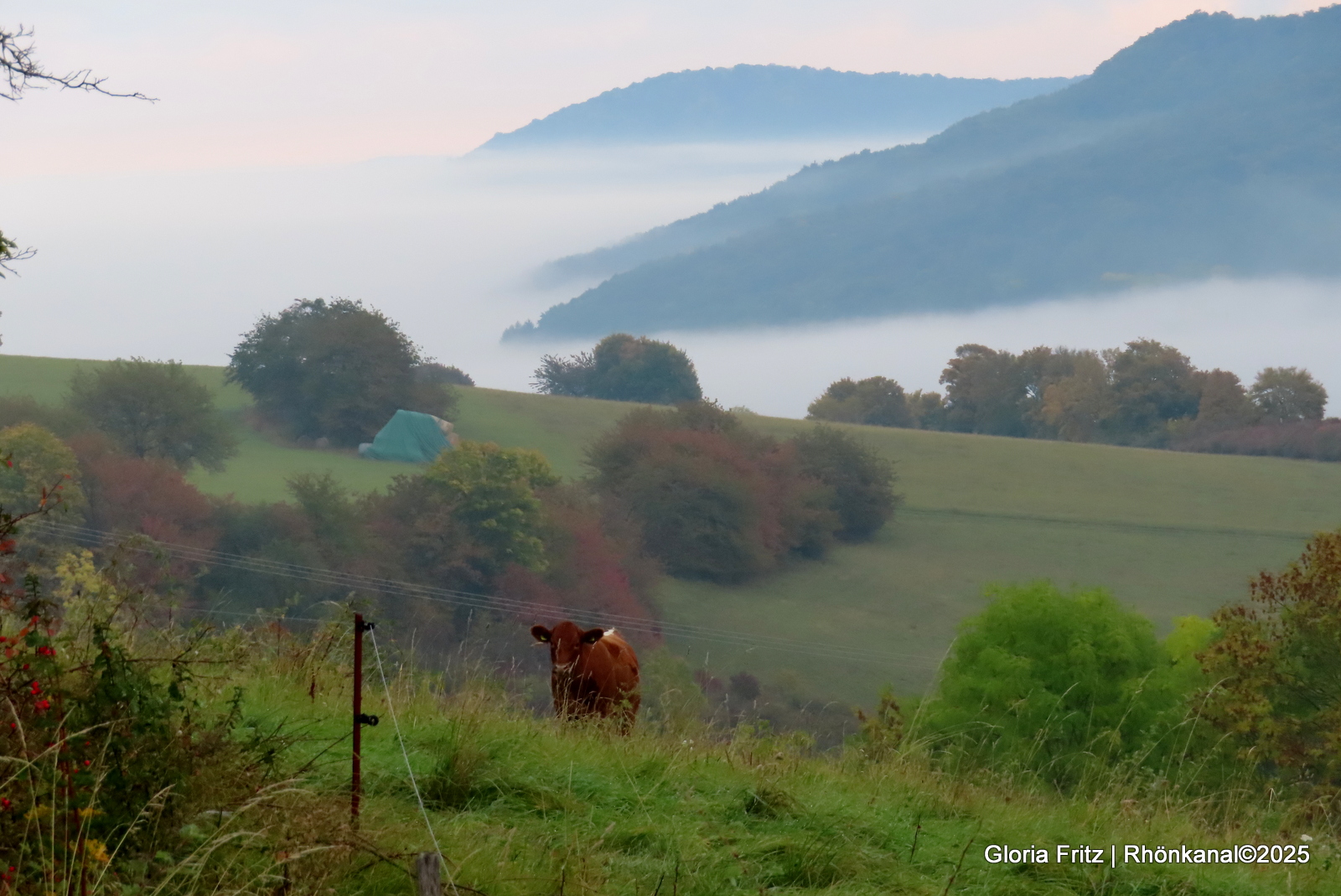 Die Rhön zeigt sich in ihrer typisch rauen Schönheit: sanfte Hügel, klare Bäche und luftige Fernsichten, über die sich Nebelschwaden legen, als würden sie die Landschaft sanft in ein neues Gewand hüllen.