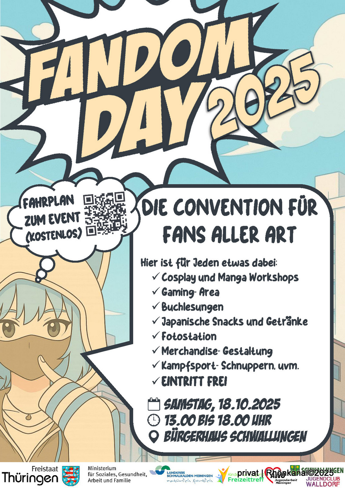 Am Samstag, den 18. Oktober 2025, wird herzlich zum Fandom Day 2025 eingeladen. Die „CONVENTION FÜR FANS ALLER ART“ findet von 13 bis 18 Uhr im Bürgerhaus in Schwallungen statt.