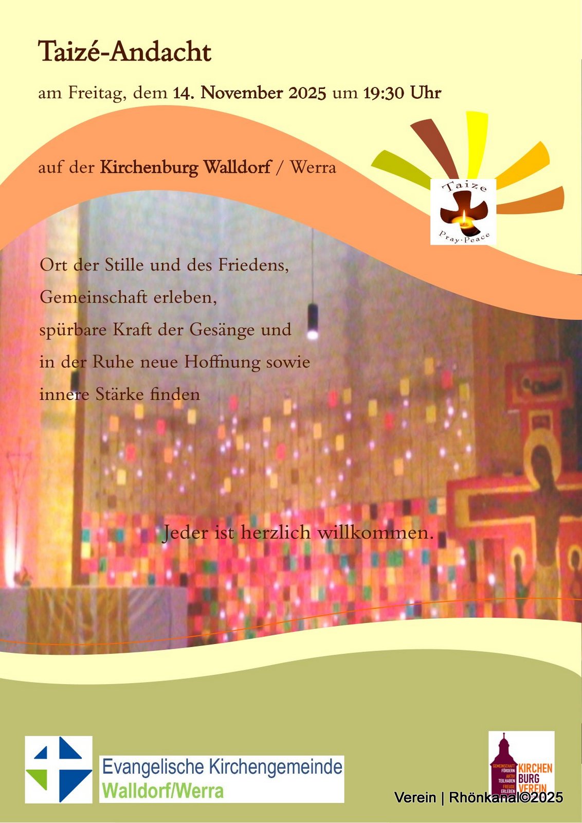 Am Freitag, den 14. November 2025, wird herzlich zur Taizé-Andacht auf die Kirchenburg in Walldorf eingeladen. Beginn ist um 19.30 Uhr. Jeder ist herzlich willkommen.