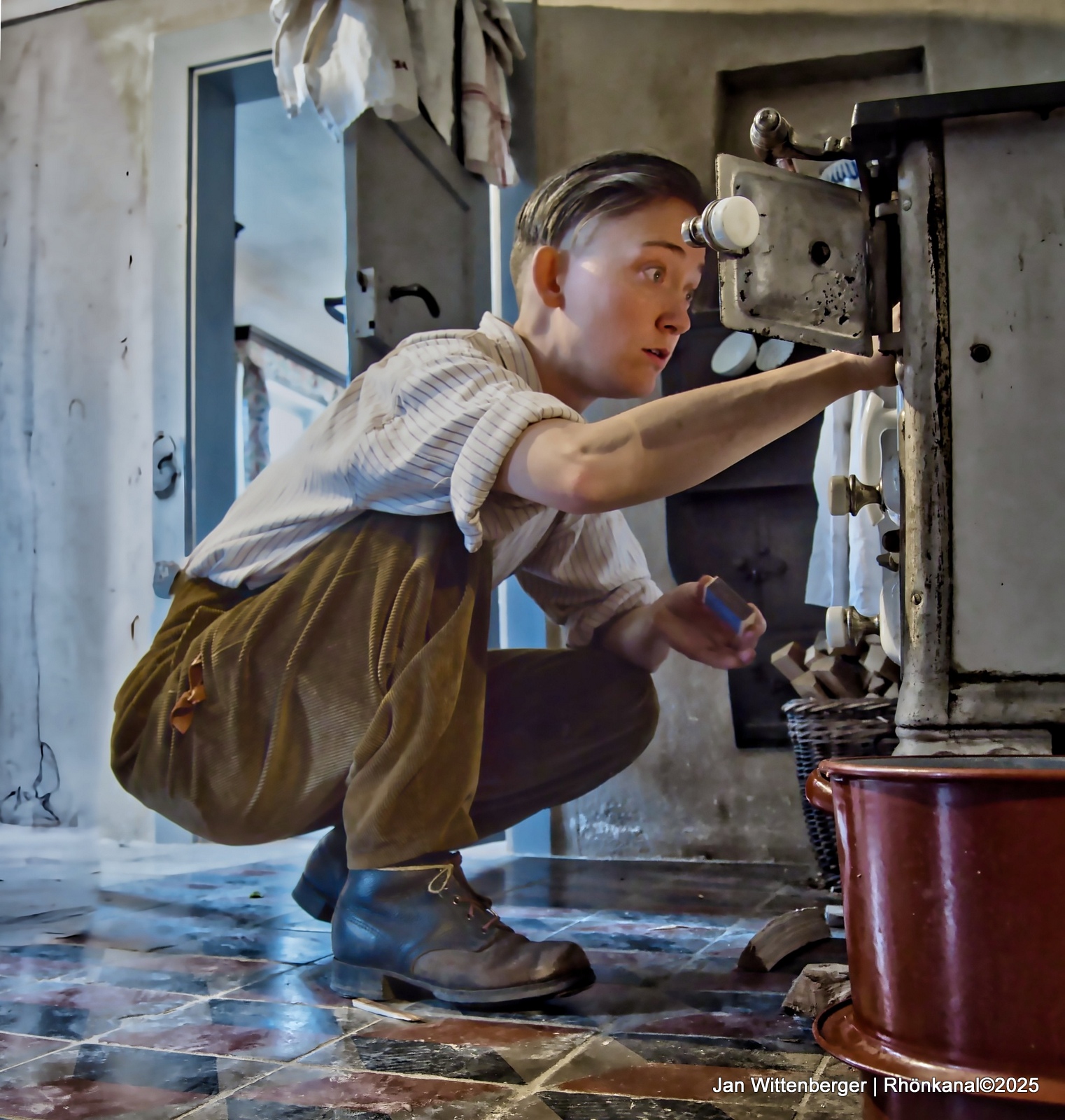 Vier Geschichtsdarstellende führen das Leben auf einer Hofstelle kurz nach dem Ersten Weltkrieg vor Augen. In zeitgenössischer Kleidung demonstrieren sie, wie gekocht, geheizt und geputzt wurde.