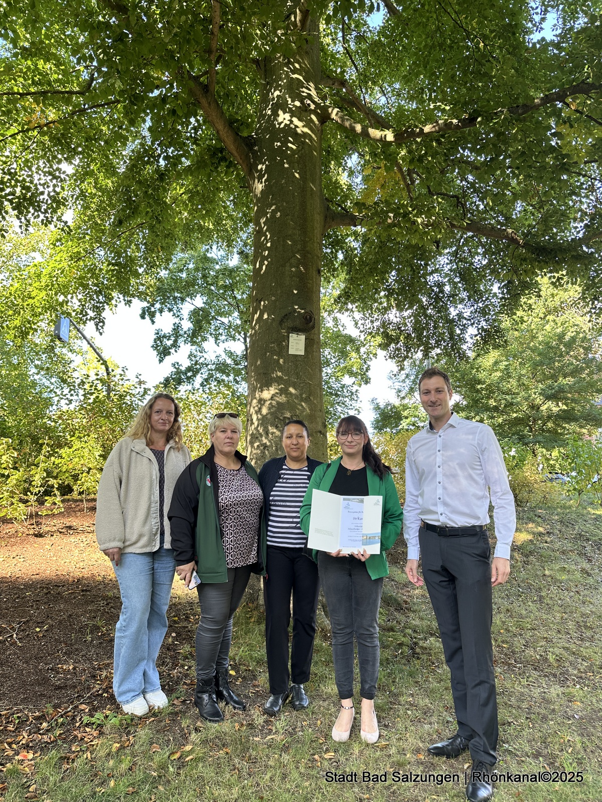 Zu feierlichen Übergabe der Baumpatenschaft trafen sich alle Beteiligten unter dem üppigen Blätterdach des Baumes im Rathenaupark.