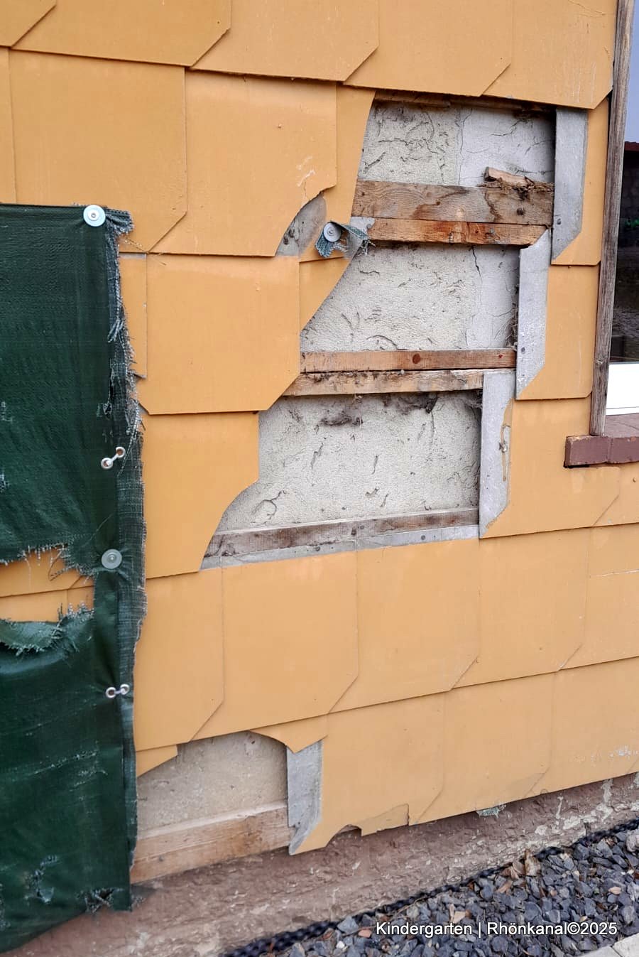 Doch damit nicht genug. Die Asbestplatten der Außenfassade fielen herab und mussten entfernt werden. Somit lag das Mauerwerk frei, welches bereits erhebliche Mängel zeigte.