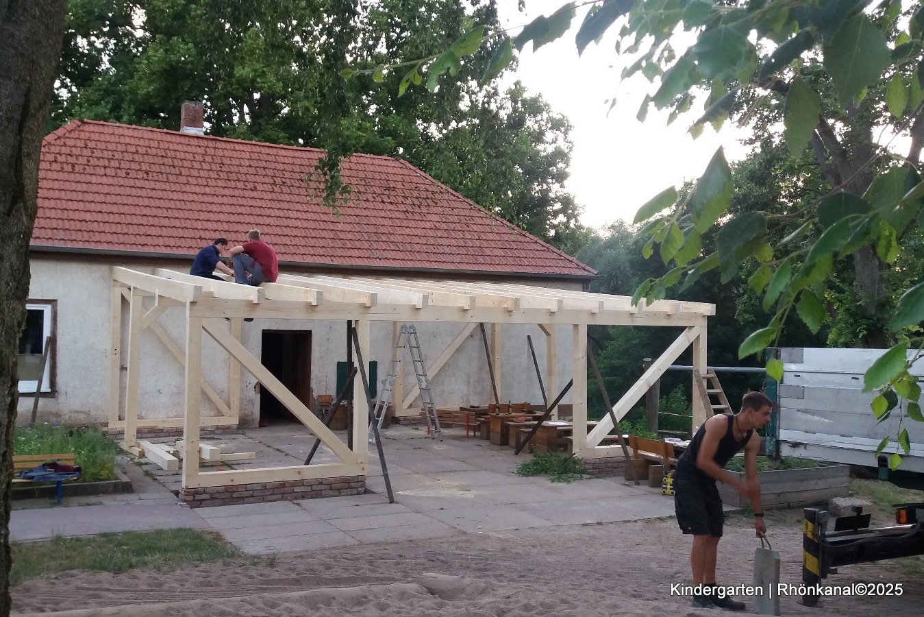 Eine großzügige Überdachung aus Holz entstand, welche den Kindern Unterschlupf bei Wind und Wetter gewährt, zum Spielen und zum Essen einlädt.