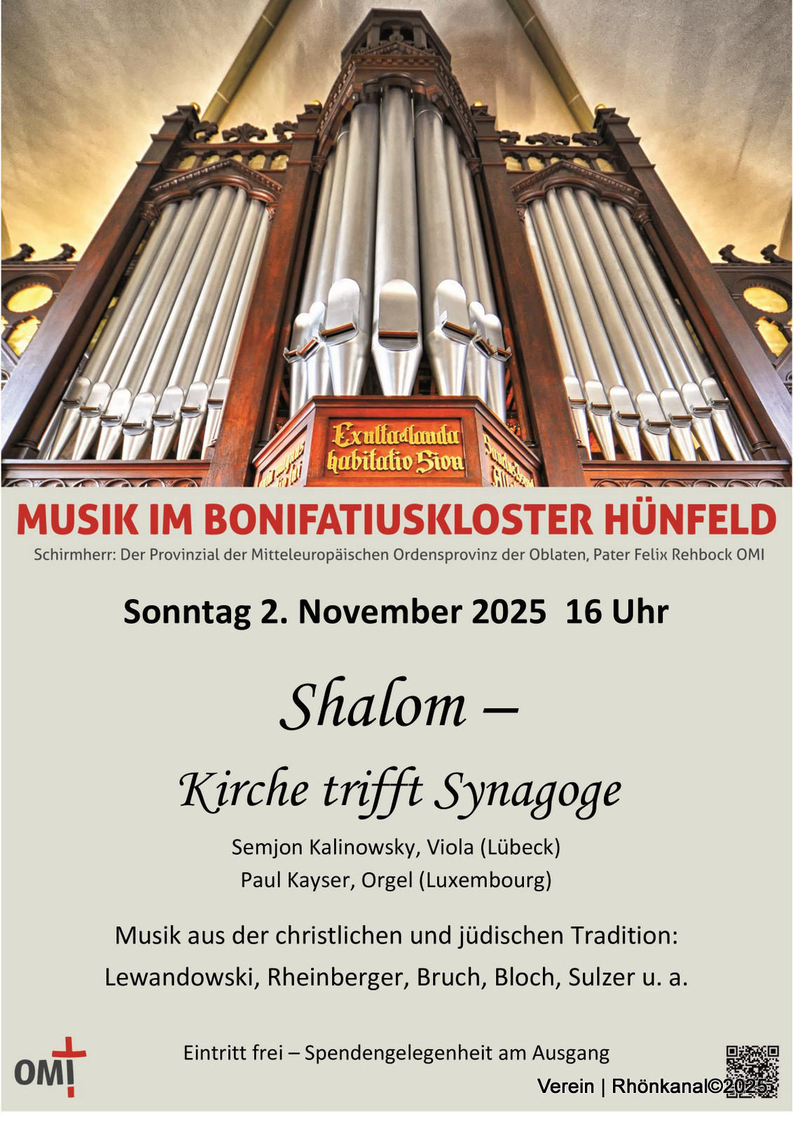 „Shalom – Kirche trifft Synagoge“: Unter diesem Motto findet das nächste Konzert in der Reihe „Musik im Bonifatiuskloster Hünfeld“ am Sonntag, den 2. November um 16 Uhr statt.
