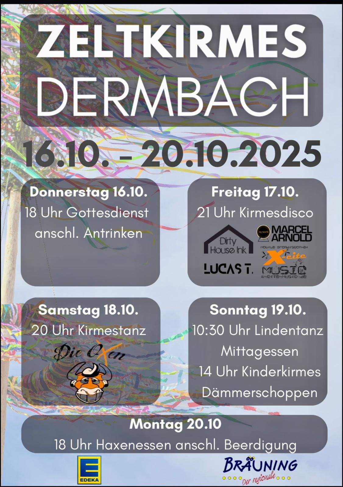 Es ist wieder soweit – die Zeltkirmes in Dermbach steht vor der Tür! Vom Donnerstag, den 16. Oktober, bis Montag, den 20. Oktober 2025 lädt die Kirmesgesellschaft herzlich zum Mitfeiern, Tanzen und Genießen ins große Festzelt ein.