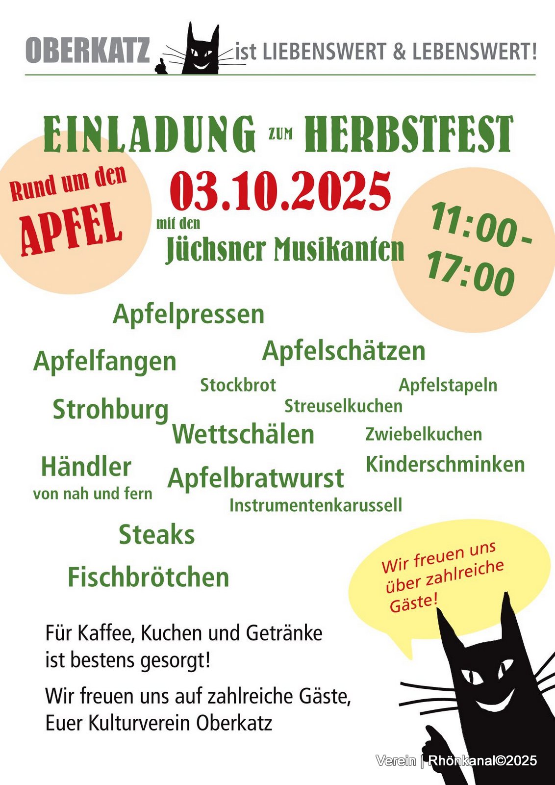 Zum traditionellen Herbstfest wird am Freitag, den 3.Oktober 2025 wieder ins Katzbachhaus nach Oberkatz eingeladen. In diesem Jahr steht alles unter dem Motto „Apfel“.