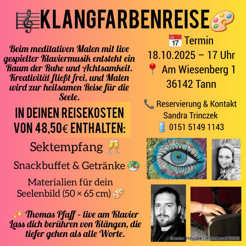 Musik und Malerei in einzigartiger Harmonie: Am Samstag, den 18. Oktober 2025, laden die Künstler Thomas Pfaff und Sandra Trinczek zu einer besonderen „Klangfarbenreise“ ein.