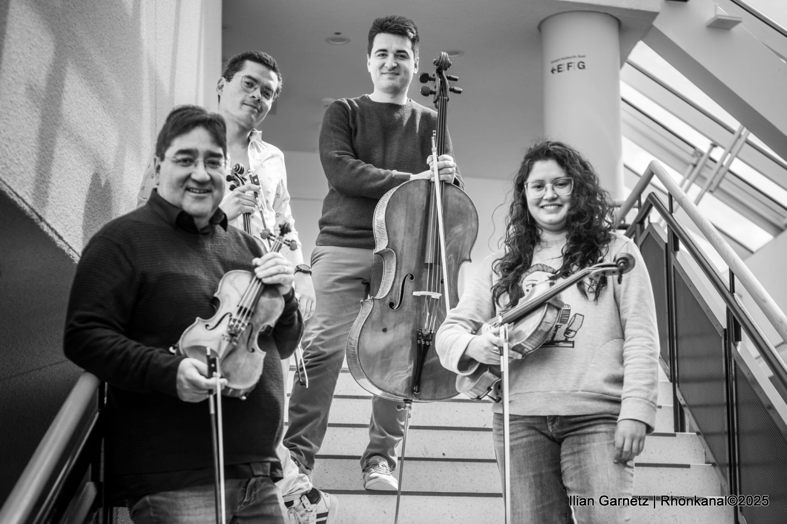 Das Cuarteto Latinoamericano de Bamberg besteht aus Raúl Teo Arias (1. Violine), Benjamin Gatuzz (2. Violine), Paulina Riquelme (Viola) und Guilherme Nardelli Monegatto (Violoncello).