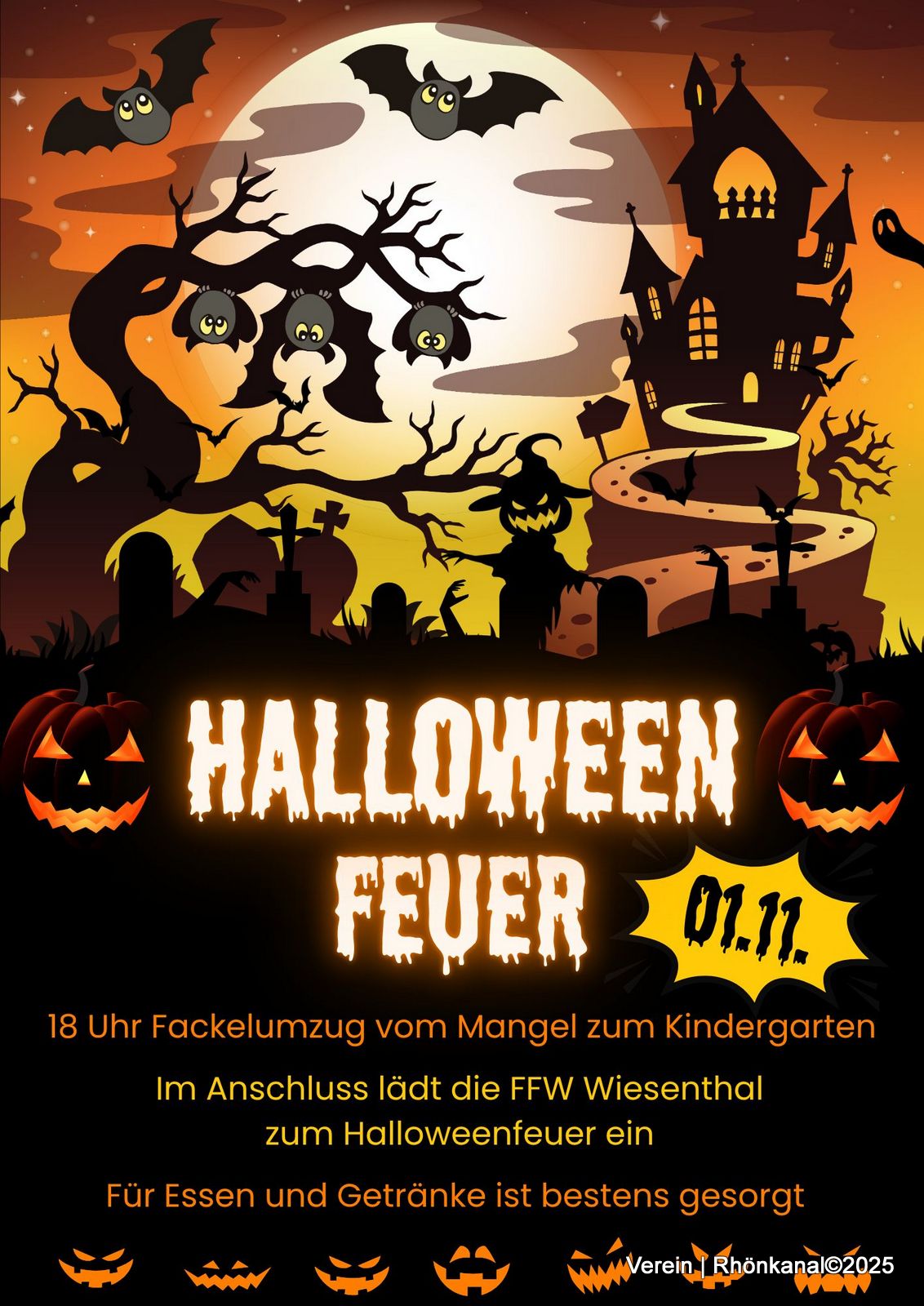Der Feuerwehrverein Wiesenthal lädt am Samstag, den 1. November 2025, herzlich zum Halloweenfeuer ein.