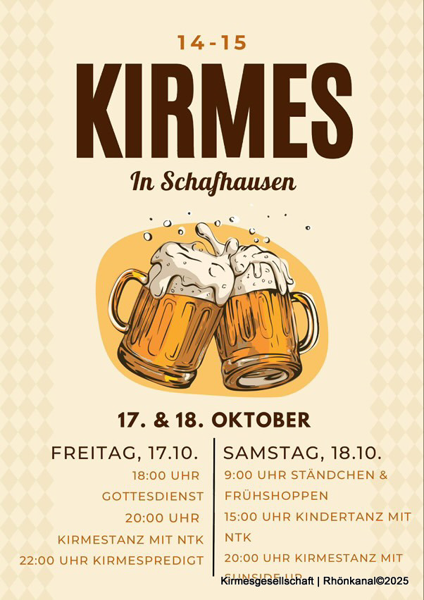 Am 17. und 18. Oktober 2025 wird in Schafhausen Kirmes gefeiert. Das Festwochenende beginnt am Freitag um 18 Uhr mit dem traditionellen Kirmesgottesdienst.