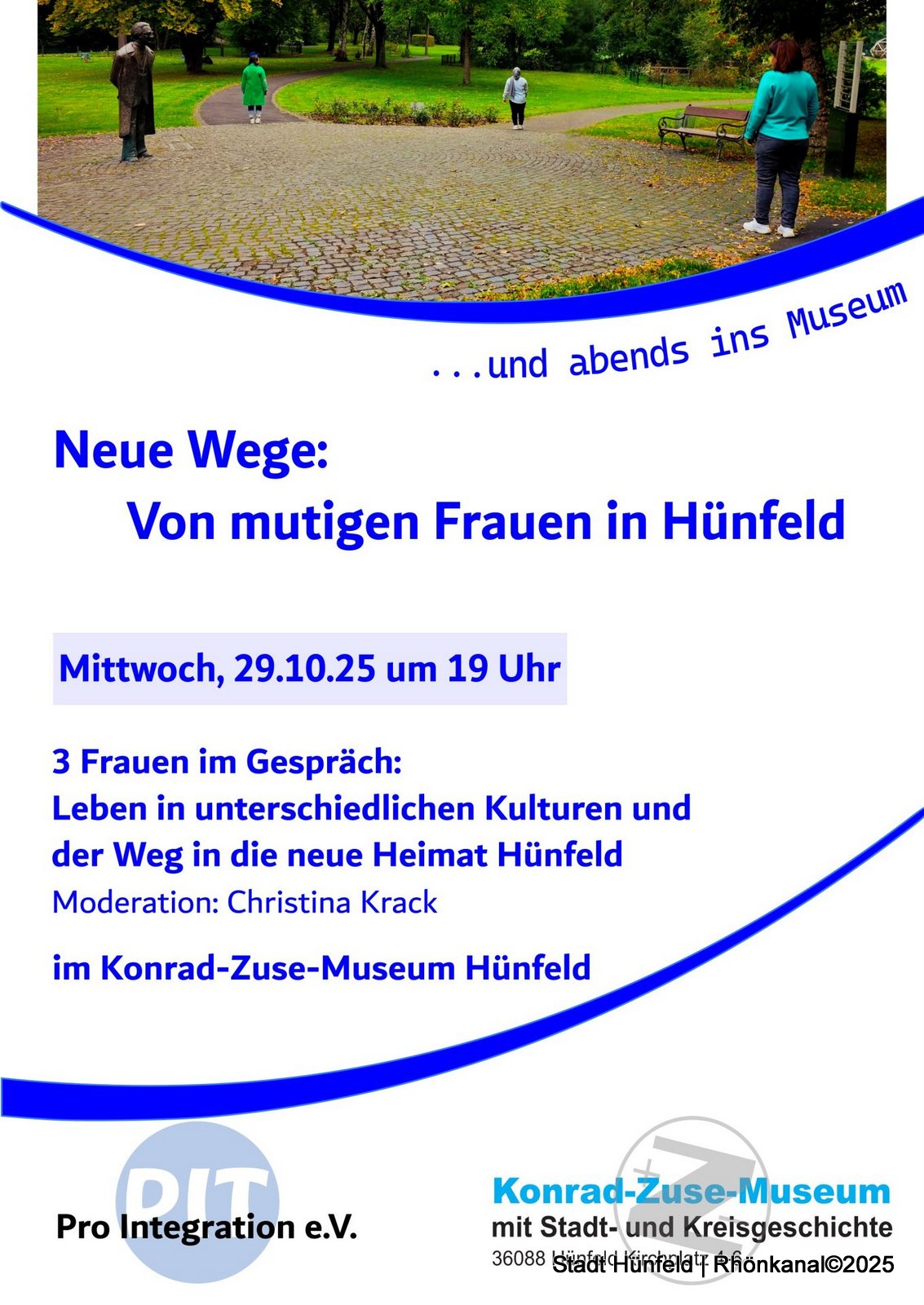 Innerhalb der Reihe „… und abends ins Museum“ bieten das Konrad-Zuse-Museum und Pro Integration e.V. (PIT) gemeinsam einen Abend zum Thema „Neue Wege: Von mutigen Frauen in Hünfeld“ an.