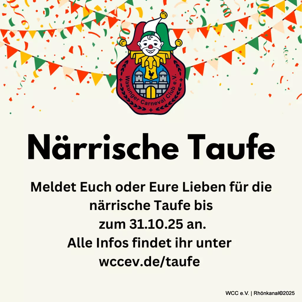 Ab 15:11 Uhr wird traditionell die „Närrische Taufe“ zelebriert. Bis zum 31. Oktober 2025 kann das ausgefüllte Anmeldeformular per Mail an taufe@karnevalwasungen.de geschickt oder analog in den Briefkasten des WCC auf dem Markt eingeworfen werden.