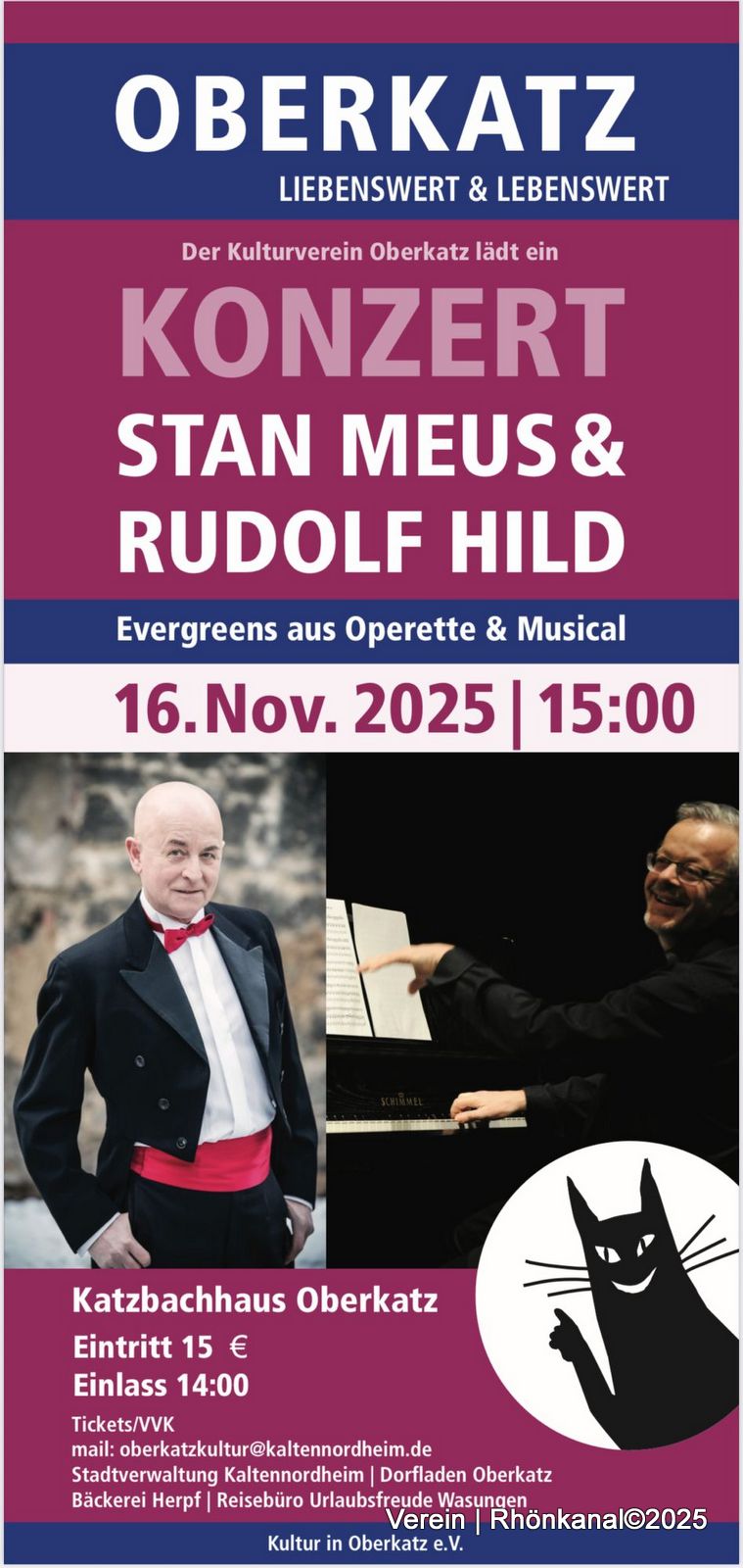 Der Kulturverein Oberkatz lädt am Sonntag, den 16. November 2025, herzlich zum Konzert mit Stand Meus und Rudolf Hild ein. Das Konzert beginnt um 15 Uhr im Katzbachhaus.