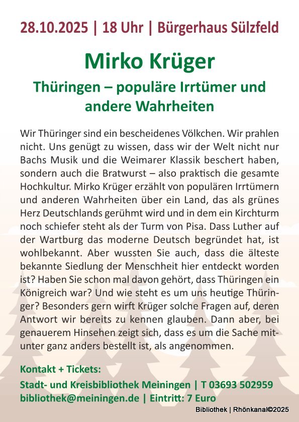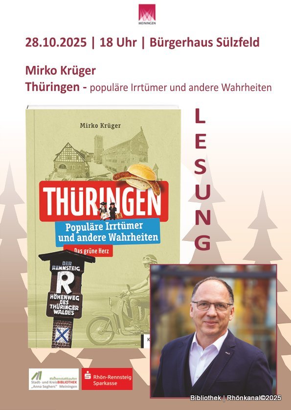 Am Dienstag, den 28. Oktober 2025, lädt die Stadt- und Kreisbibliothek "Anna Seghers" zu einer Lesung von und mit Mirko Krüger ins Bürgerhaus nach Sülzfeld ein.