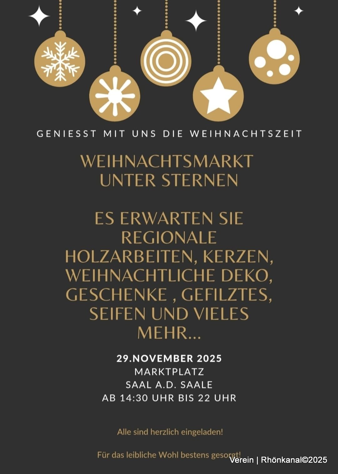 In Saal an der Saale findet dieses Jahr wieder ein Weihnachtsmarkt statt. Am Samstag, den 29. November 2025 verwandeln sich der Marktplatz in ein Weihnachtsparadies.