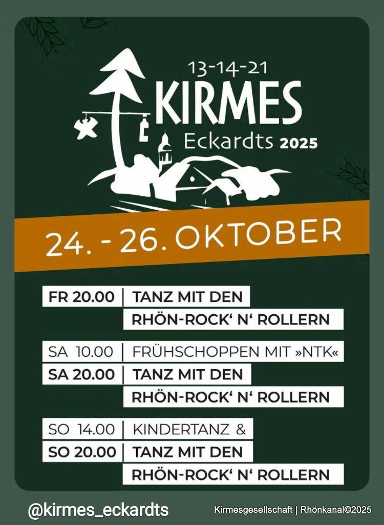 Die Jugend- und Feuerwehrvereine aus Eckardts laden vom 24. bis 26. Oktober 2025 zur 551. Kirmes auf den Tanzsaal nach Eckardts ein.