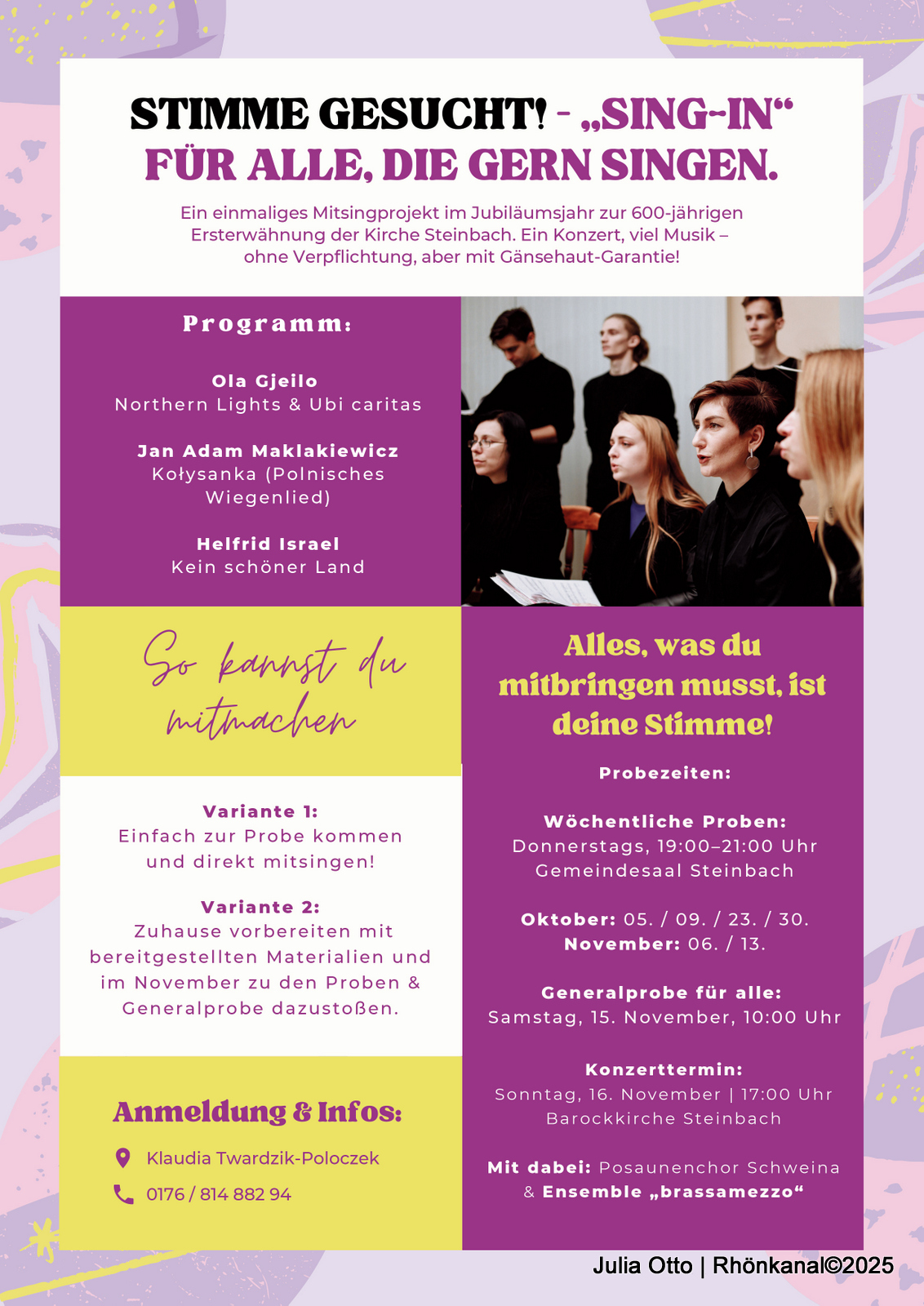 Die Kirchgemeinde Steinbach und Meimers lädt alle Singbegeisterten herzlich ein, Teil dieses besonderen Projekts zu werden. Wer Freude daran hat, gemeinsam mit anderen zu singen und seine Stimme in einem größeren Klangraum zu erleben, ist herzlich willkommen.