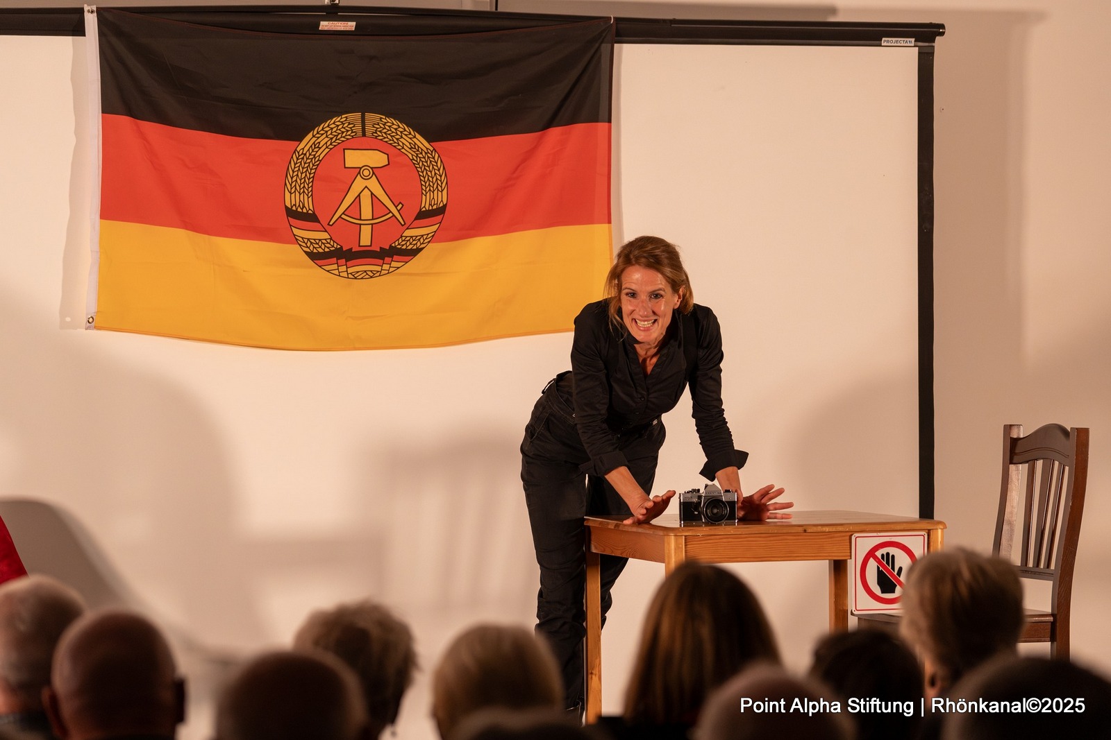 Die Aufführung erzählt entlang der Erinnerungen der Ex-Stasi-Agentin DDR-Geschichte und zeigt SED-Unrecht. Eingangs begrüßt wurden die Gäste von Philipp Metzler, Vorstand der Point Alpha Stiftung, der sich zugleich bei der Hessischen Landeszentrale für politische Bildung (HLZ) für die Kooperation bedankte.