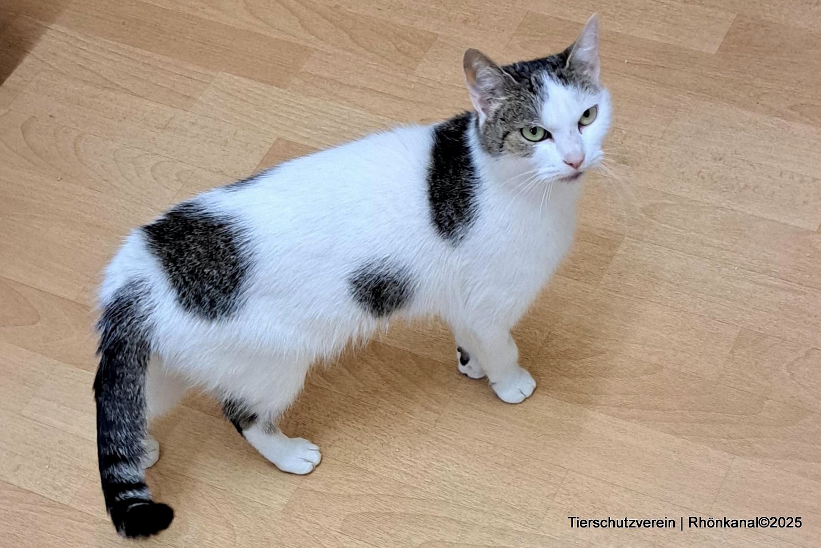Der grau-getigert-weiße Kater mit der putzigen Fellzeichnung – einem Kinnfleck und einem „Strumpf“ am rechten Vorderbein – ist äußerst liebesbedürftig und genießt jede Art von menschlicher Zuwendung.