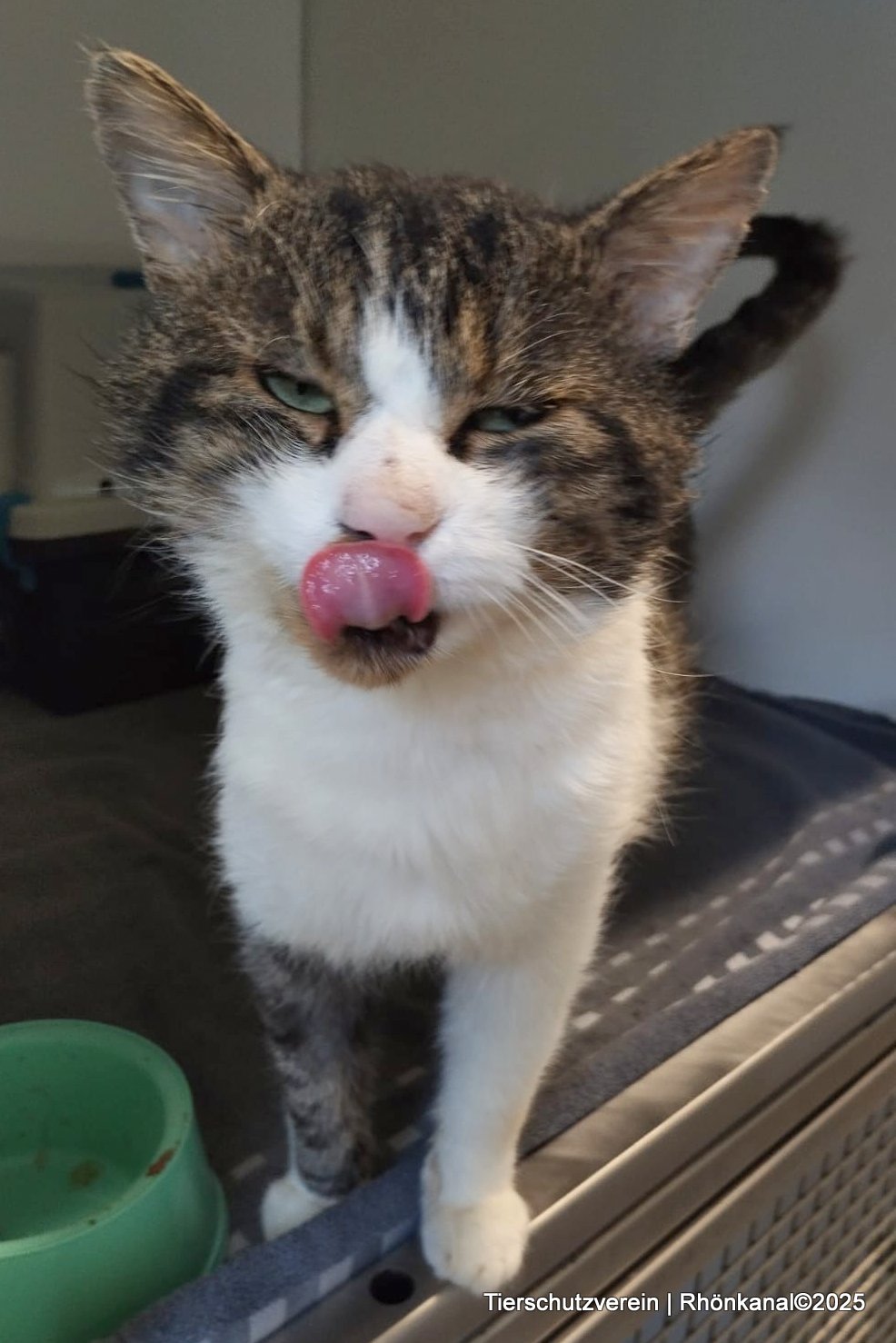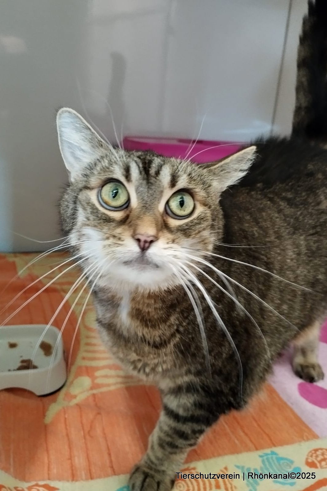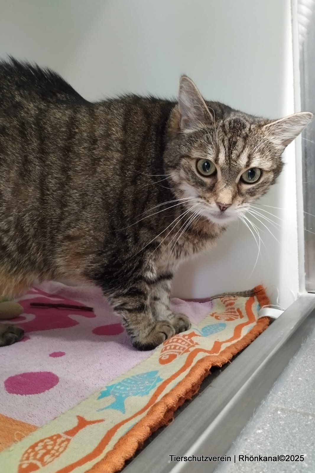 Das schätzungsweise dreijährige Tigerfräulein wurde Mitte Mai, zu dieser Zeit hochträchtig, als Fundkatze aus Kühndorf ins Meininger Tierheim gebracht. Dort konnte die wilde, ängstliche Miez zehn Tage später in aller Ruhe ihre drei Kitten zur Welt bringen, um die sie sich auch gut kümmerte.