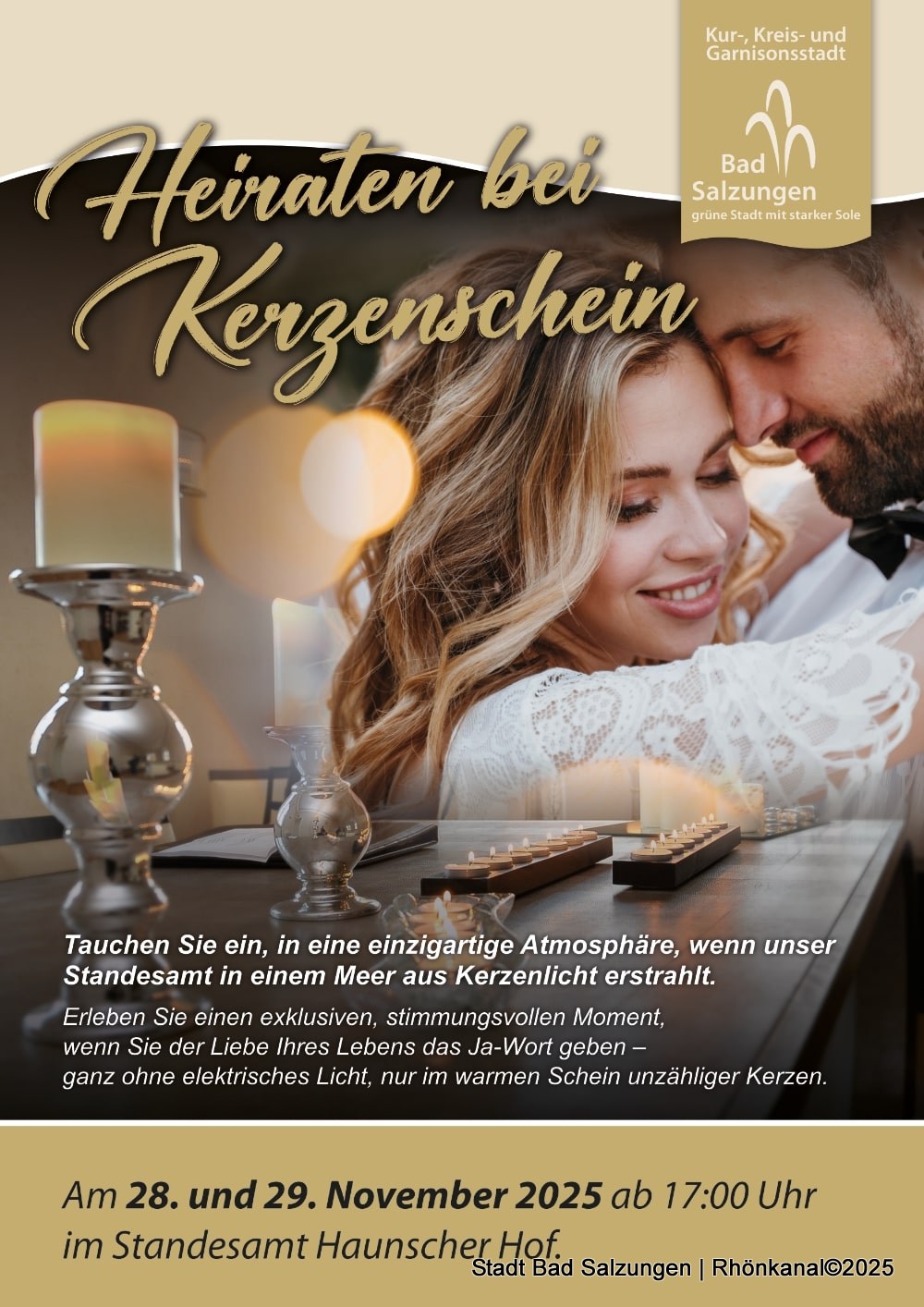 Am 28. und 29. November 2025 finden im Standesamt Bad Salzungen Trauungen bei Kerzenschein statt. Ab 17 Uhr tauchen die Brautpaare in eine einzigartige Atmosphäre ein.