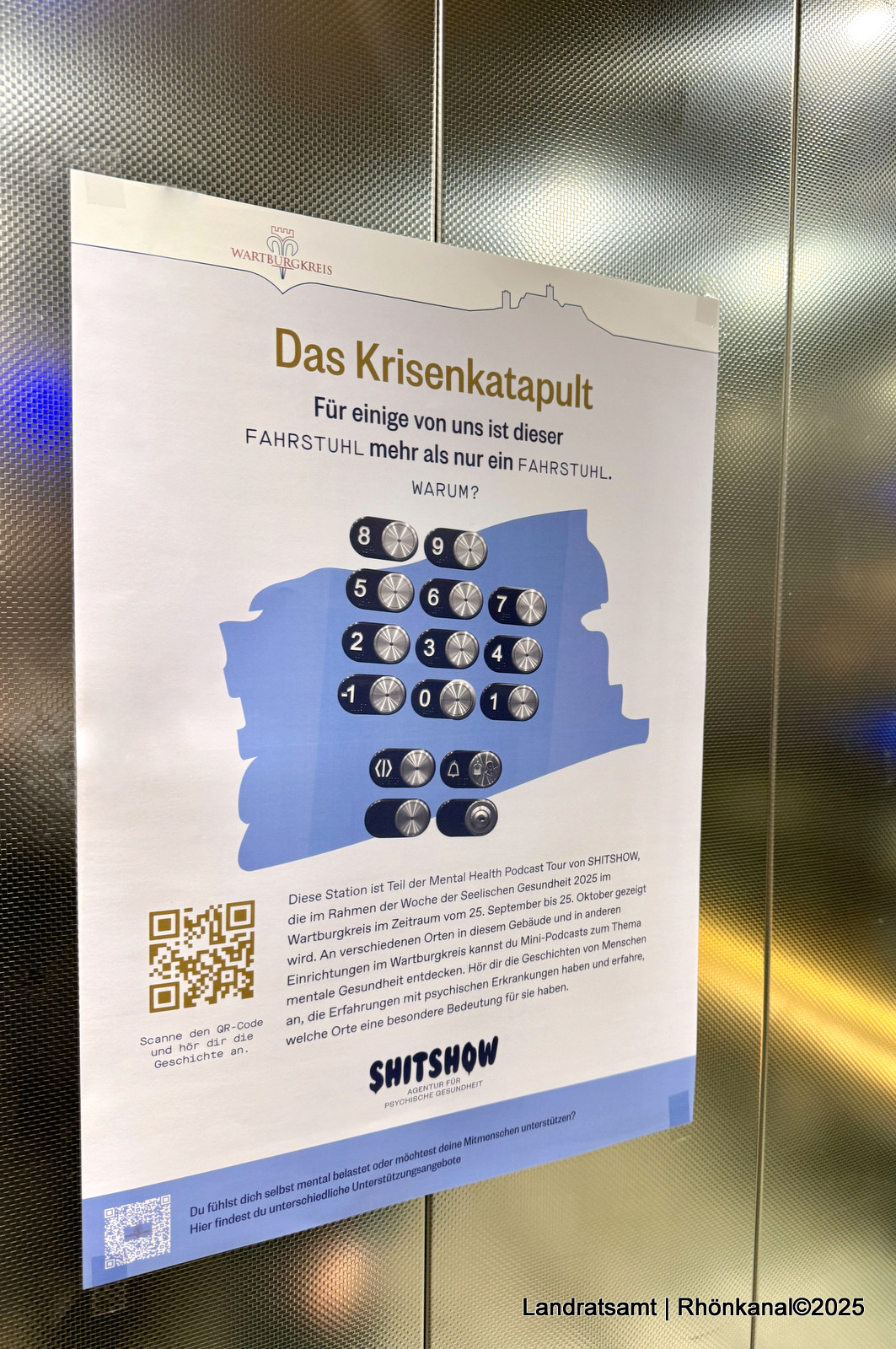 Die Plakat-Tour startete im September und ist noch bis 25. Oktober 2025 verfügbar. Es ist eine immersive Audio-Ausstellung, organisiert vom Landratsamt Wartburgkreis in Zusammenarbeit mit Shitshow – Agentur für psychische Gesundheit GmbH, welche die Perspektiven von Menschen mit psychischen Erkrankungen nachvollziehbar macht.