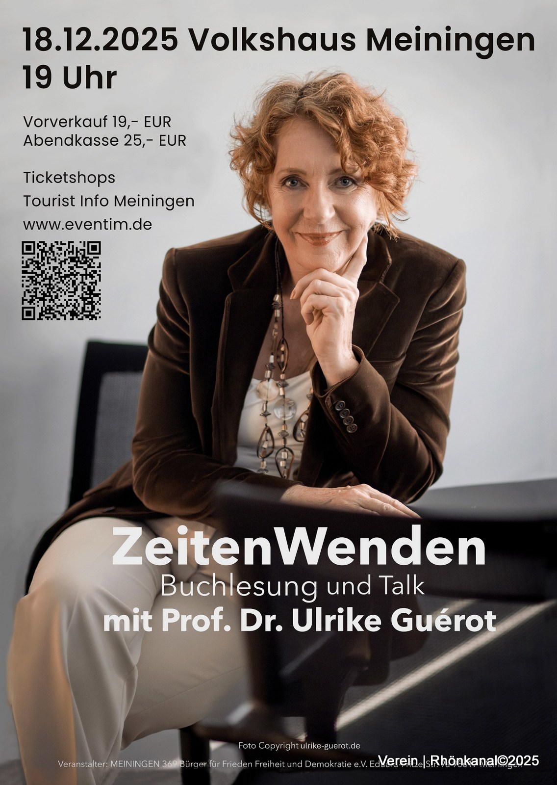 Am Donnerstag, den 18. Dezember 2025, wird herzlich zu Buchlesung und Talk mit Prof. Dr. Ulrike Guérot ins Volkshaus Meiningen eingeladen. Beginn ist um 19 Uhr.