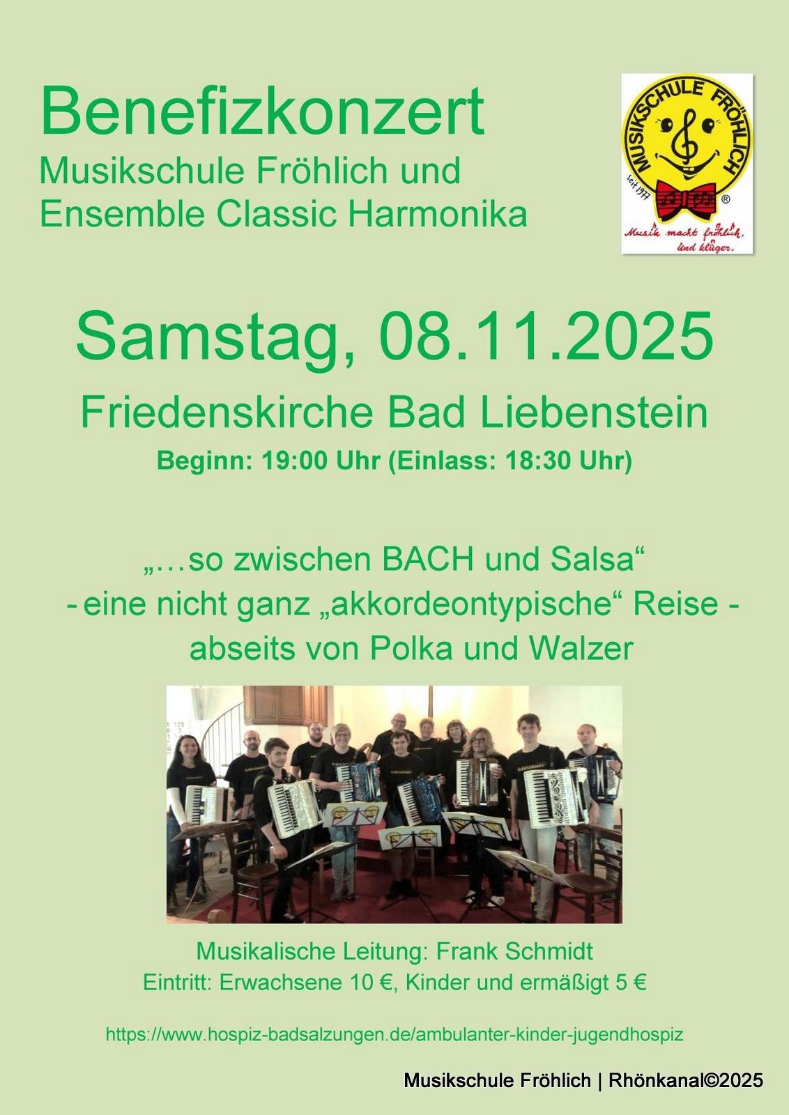 Zu einem besonderen musikalischen Abend laden die Musikschule Fröhlich und das Ensemble Classic Harmonica am Samstag, den 8. November 2025, in die Friedenskirche Bad Liebenstein ein. Beginn ist um 19 Uhr.