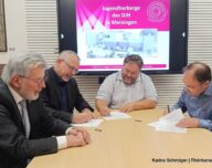 Die Stadt Meiningen hat einen wichtigen Schritt in Richtung Zukunft getan: Am Dienstagnachmittag unterzeichneten Bürgermeister Fabian Giesder, Siegfried Wetzel (Vorstand der Thüringer Jugendherbergen gGmbH), Bertram Tittel (Geschäftsführer des DJH Landesverband Thüringen e.V.) sowie Roland Fries (Eigentümer der Mittelmühle) eine gemeinsame Absichtserklärung zum Bau einer Jugendherberge in Meiningen.