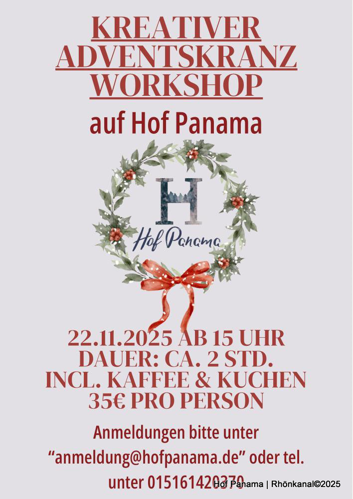 Am Samstag, den 22. November 2025, findet auf Hof Panama ein kreativer Adventskranz-Workshop statt. Ab 15 Uhr haben die Teilnehmenden etwa zwei Stunden Zeit, ihren ganz persönlichen Kranz herzustellen.