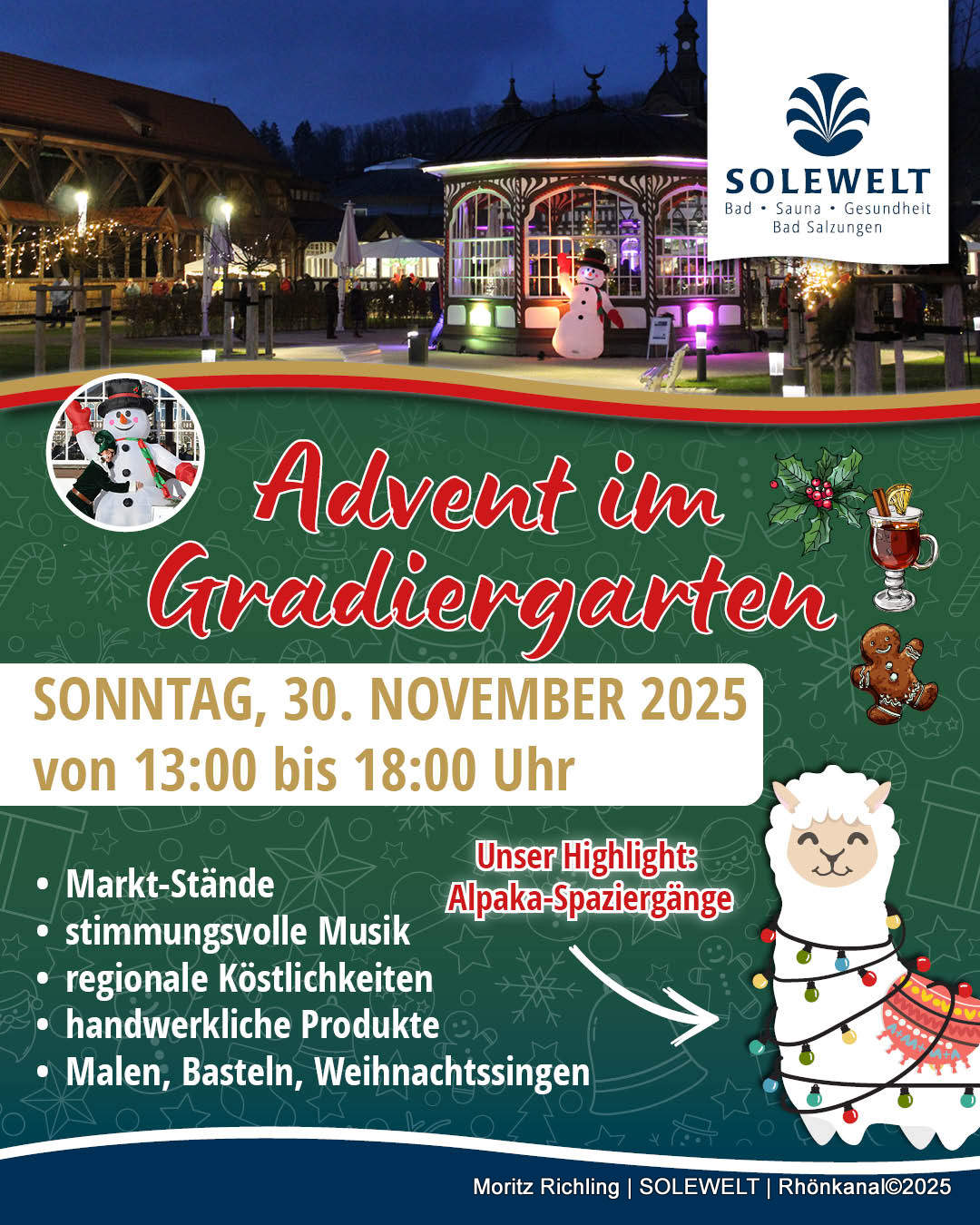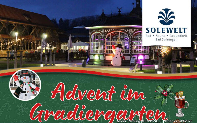 Traditionell locken am ersten Advent, den 30. November 2025, wieder Markt-Stände mit regionalen Köstlichkeiten und handwerklichen Produkten in den Bad Salzunger Gradiergarten, die SOLEWELT sowie die Trinkhalle.