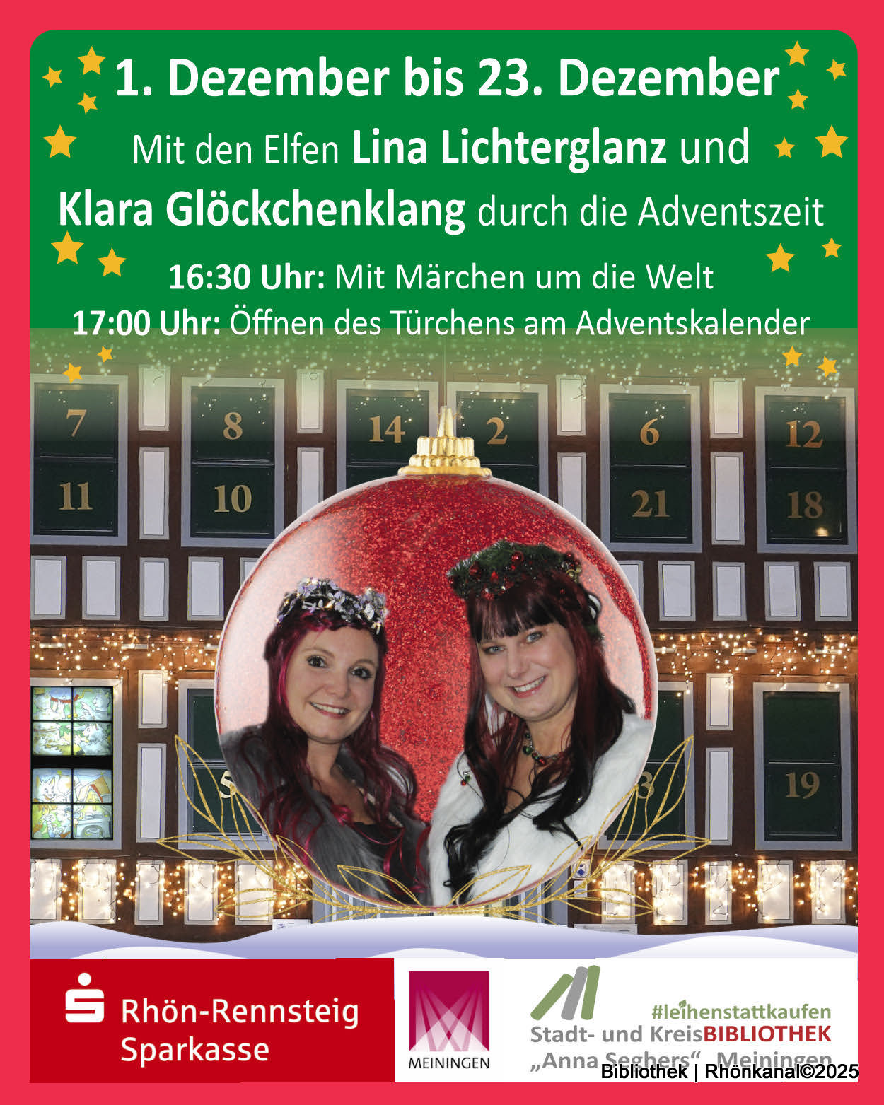 Schon am 2. Dezember wartet das erste Highlight auf Euch: Um 15 Uhr begleiten Euch Sylvia Gramann- Reepschläger und Barbara Brandt durch die 25-jährige Geschichte des Meininger Adventskalenders.