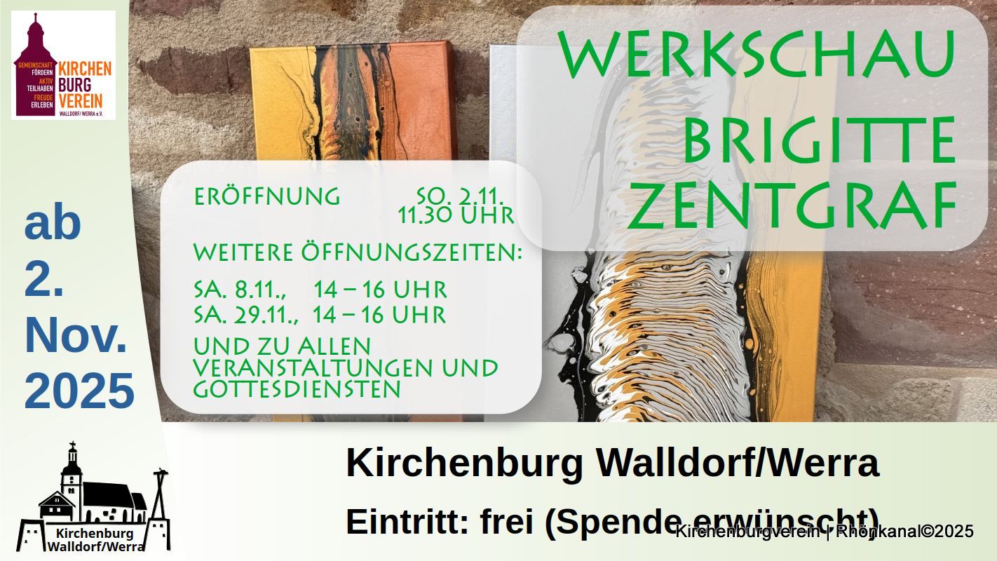 Die Ausstellung eröffnet im Beisein der Künstlerin am Sonntag, den 2. November 2025, nach dem Gottestdienst um 11.30 Uhr. Weitere Möglichkeiten, mit Frau Zentgraf in Gespräch zu kommen, sind am 8. und 29. November, jeweils von 14 bis 16 Uhr.