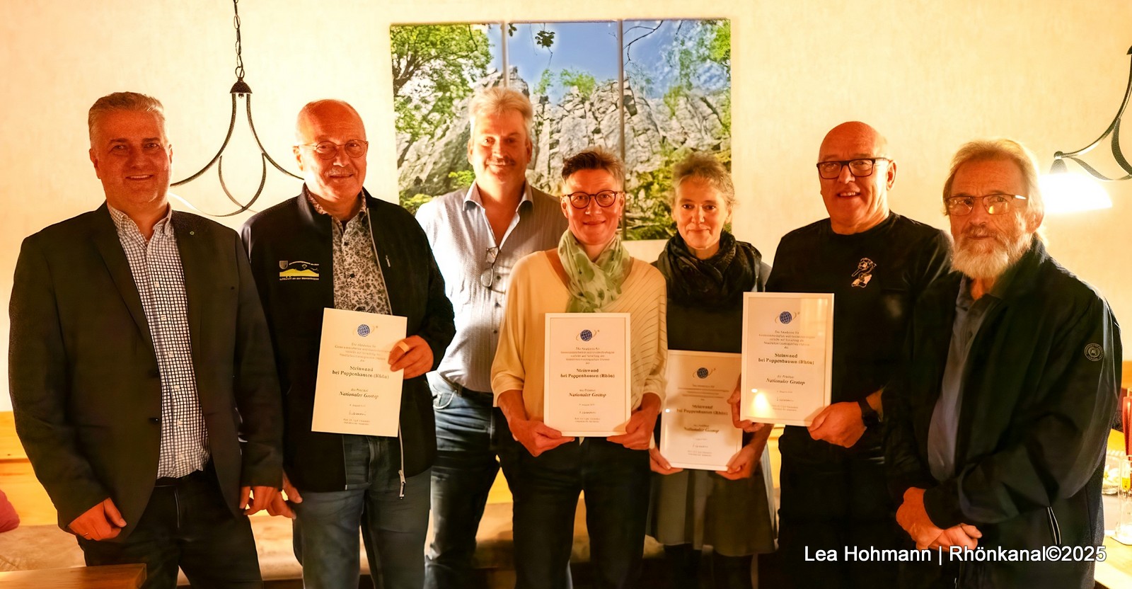 Von der Akademie für Geowissenschaften und Geotechnologie (AGG) wurde sie daher als Nationales Geotop ausgezeichnet – nun erfolgte im Rahmen einer kleinen Feierstunde im Gasthaus „Zur Steinwand“ die offizielle Übergabe der Urkunden an Bürgermeister Manfred Helfrich von der Gemeinde Poppenhausen sowie die beteiligten Akteure und Eigentümer von der Steinwand.