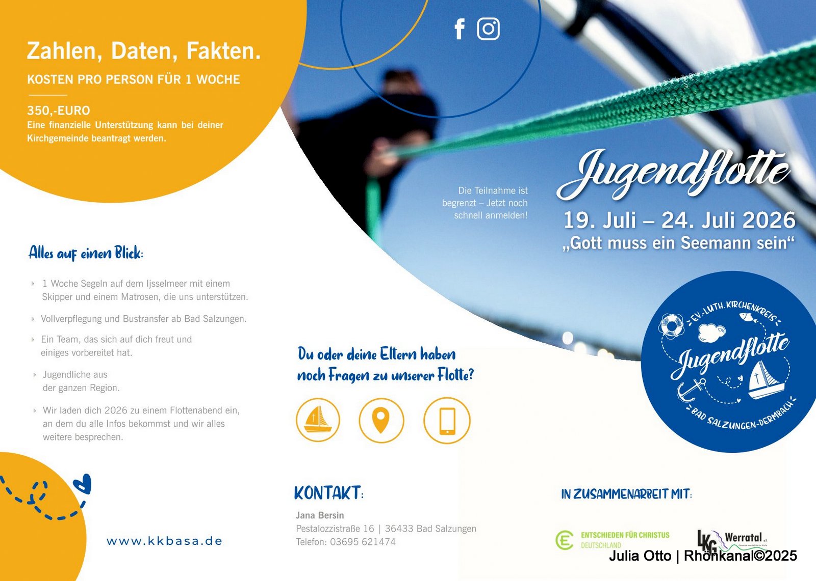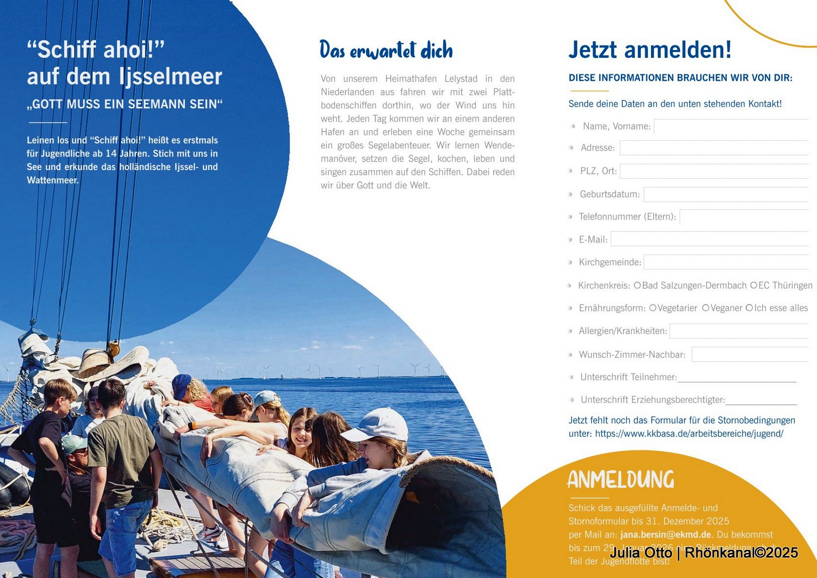 Anmeldeschluss ist der 31. Dezember 2026. Du oder deine Eltern haben noch Fragen zur Jugendflotte? Unsere Jugendmitarbeiterin Jana Bersin steht euch unter: jana.bersin@ekmd.de oder per Telefon unter: 03695 621474 zur Verfügung.